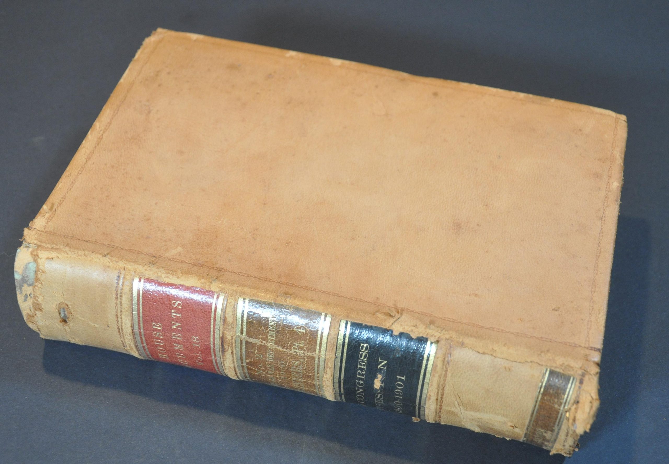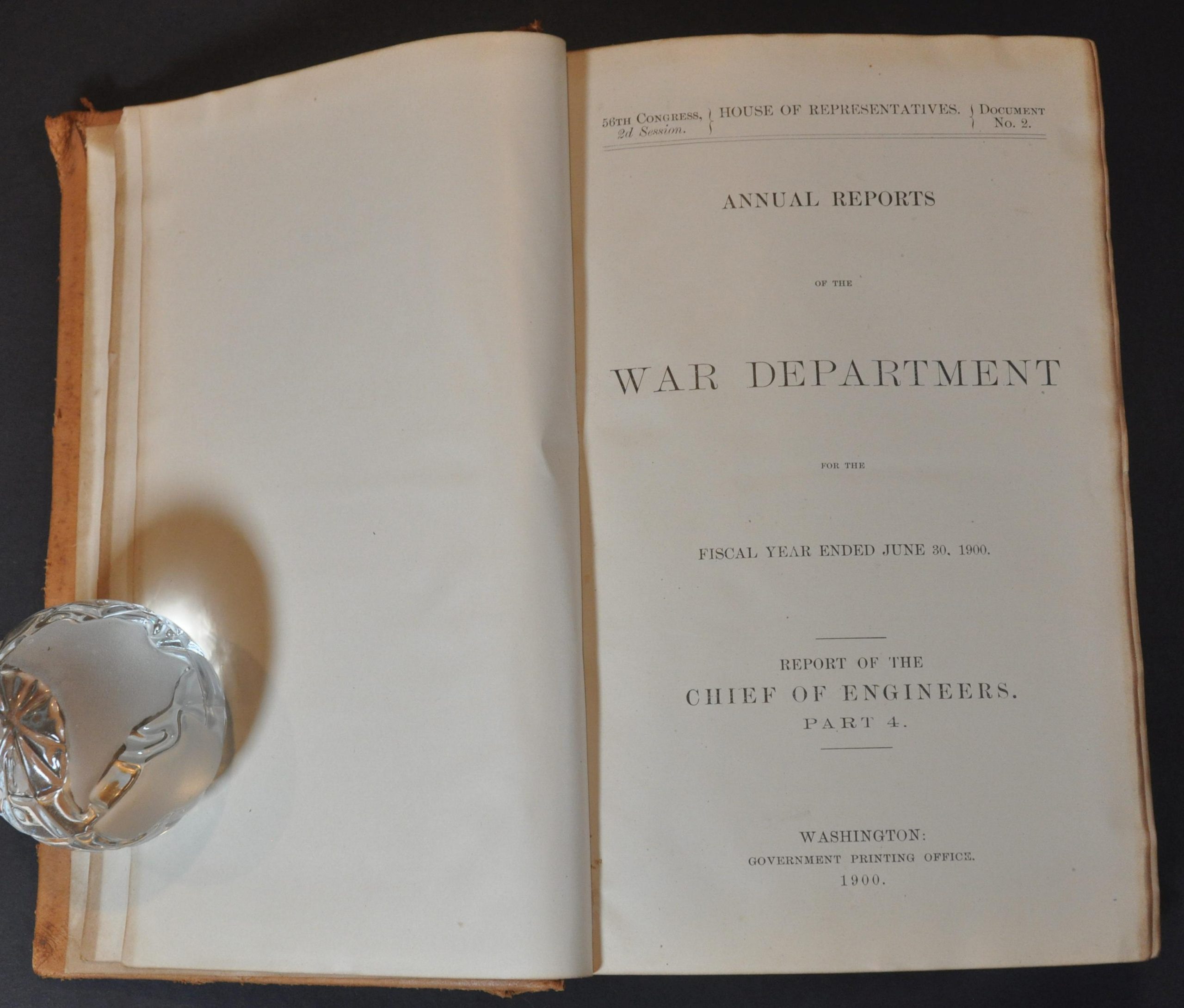 Condition Description: Part 4 of the 1900 Appendixes to the Report of the Chief of Engineers of the United States Army. 612 pp. +48 page index and dozens of folding charts, photographic plates, etc. Bound in original full leather, though the spine is broken and the covers show moderate wear. Contents are generally good to very good, with wear along fold lines, spotting and toning along the fore-edge, scattered dirty fingerprints, etc. Between good and very good condition overall.