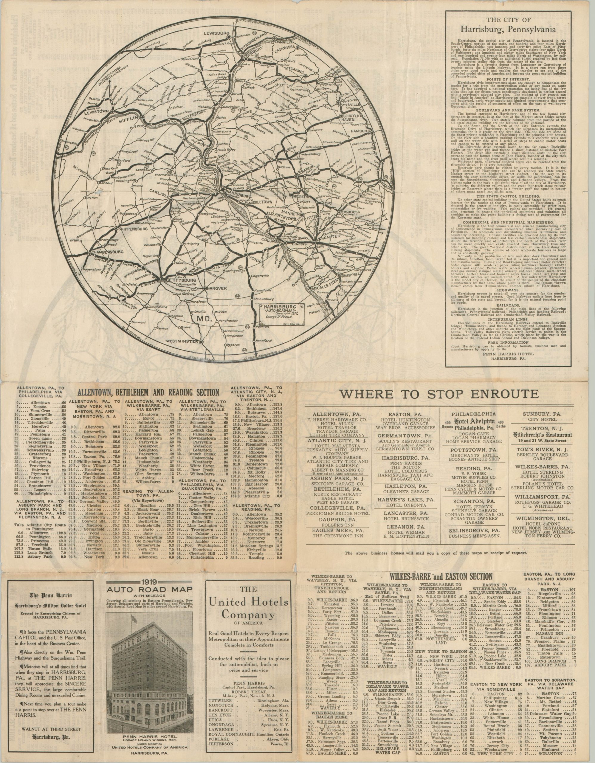 Four separate routes are identified, all predating the numbered highway system – The Sullivan Trail, Lincoln Highway, William Penn Highway, and The Susquehanna Trail. Surrounding the map are itineraries with corresponding distances between some of the larger cities and popular seashore resorts. This relatively inefficient system would soon be replaced by overlaying distance values directly on the map. The verso presents additional itineraries, contemporary advertisements, and a similar map, though with the content restricted to sixty miles around Harrisburg.