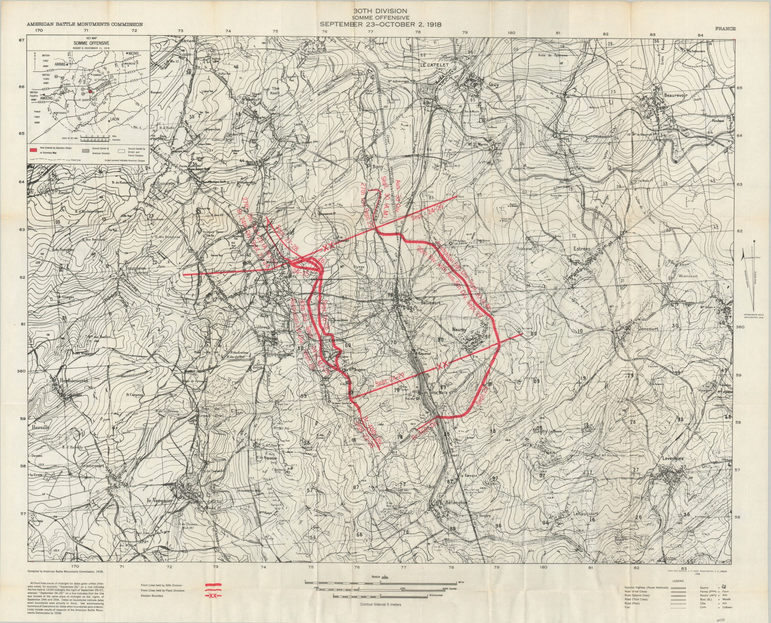 This detailed contour map covers an area in northeastern France that was the scene of heavy fighting during the First World War. It was modified by the Army Map Service in 1938 on behalf of the American Battle Monuments Commission to commemorate the actions of the 30th Infantry Division in the Somme Offensive, between September 23 and October 2, 1918.