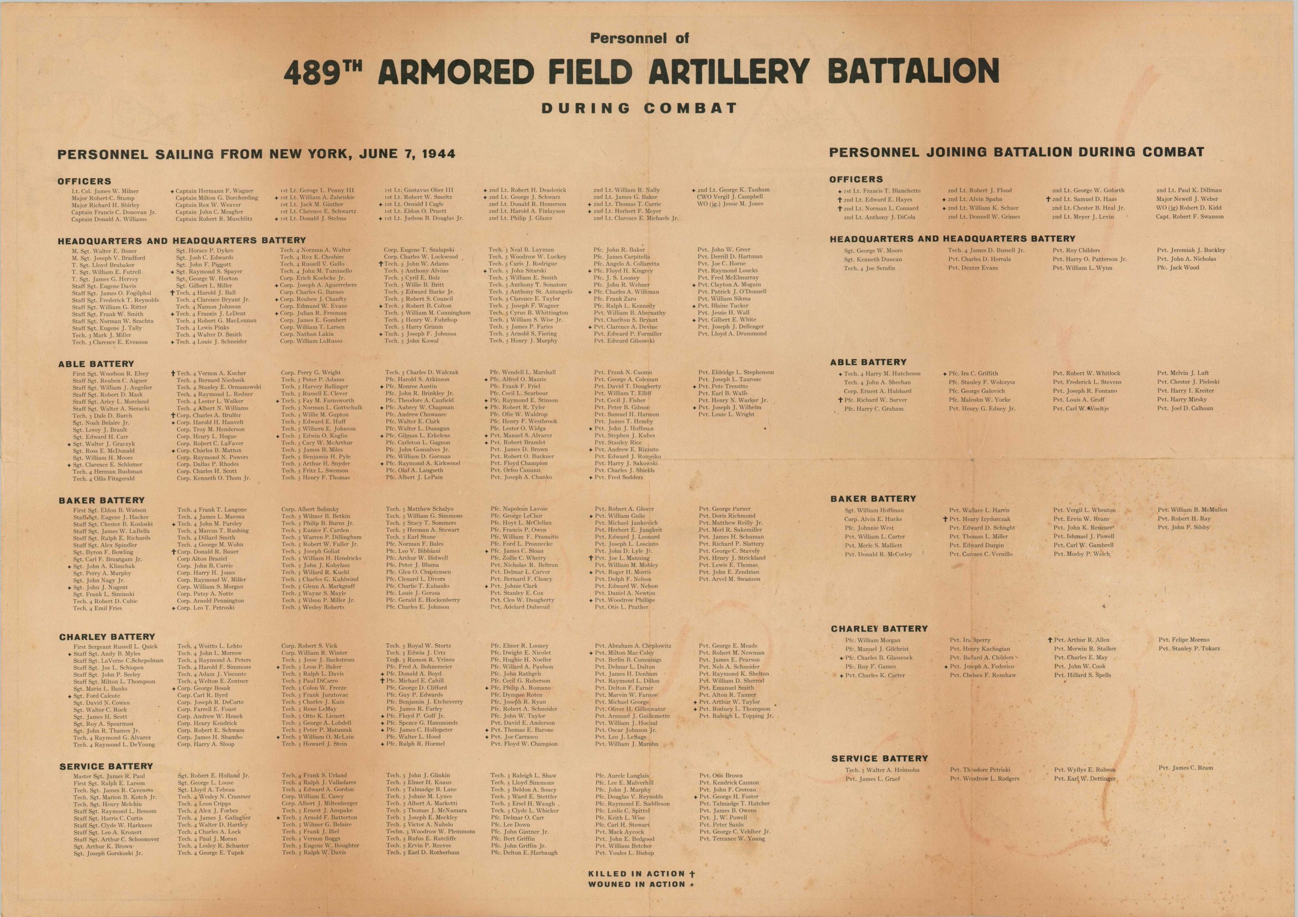 Operating at part of the 7th Armored Division (insignia in upper center), the 489 Armd. F.A. Bn. participated in several notable engagements, including the Battle of the Bulge. Their primary weapon, the M7 ‘Priest’ 105 mm self-propelled gun, is featured throughout the image.