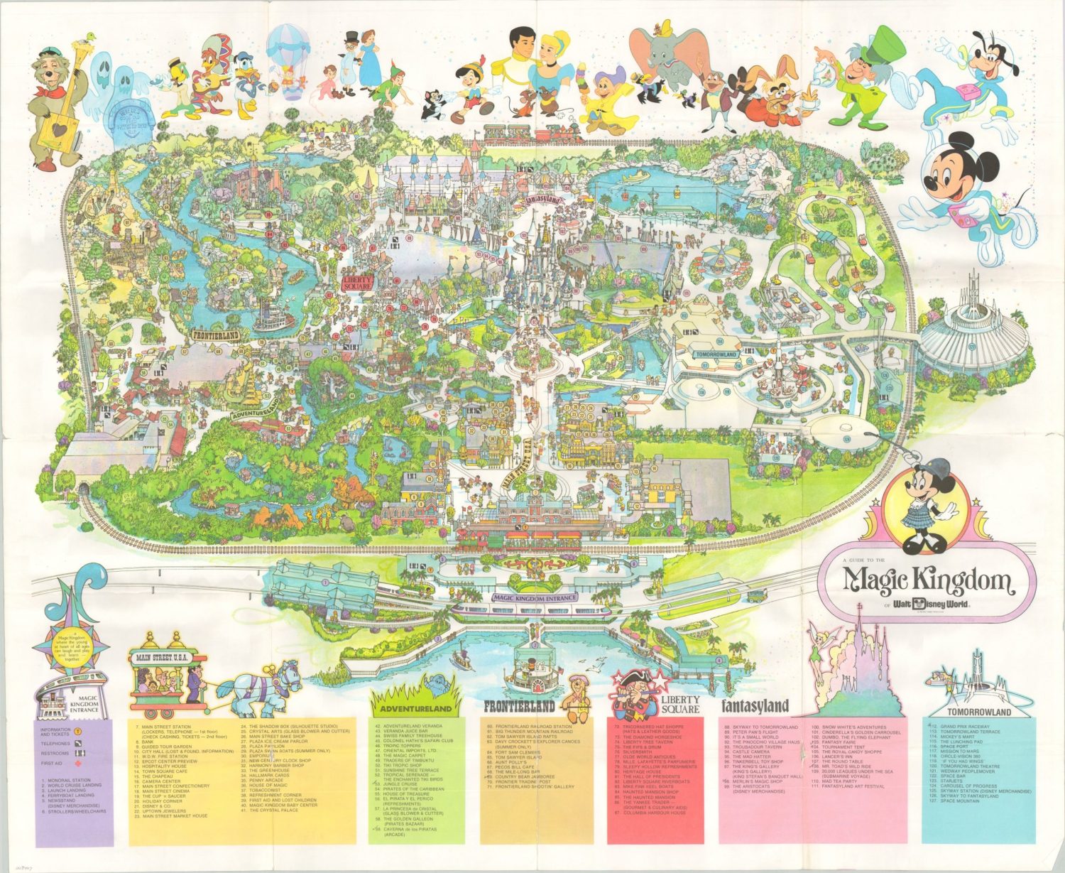 A cartoon bird’s eye view outlines each of the six separate subregions in vibrant full color; Main Street, U.S.A., Adventureland, Frontierland, Liberty Square, Fantasyland, and Tomorrowland. Attractions, amenities, rides, and shops are individually illustrated and numbered (over 125 in all); each corresponding to the legends across the bottom of the page. Many of Disney’s most iconic characters can be seen along the top of the page.