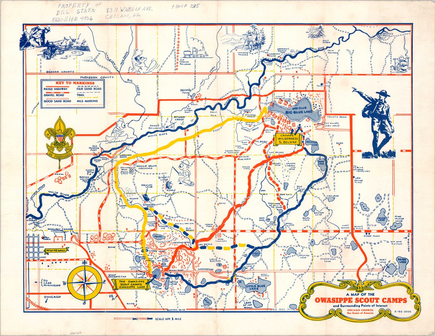 This charming map of the Owasippe Scout Reservation was illustrated by camp veteran Jack Perz and published in 1946 by the Chicago Council of the Boy Scouts of America. Established in 1911, Owasippe is the nation’s oldest continually operating Scout Camp, eventually growing to nearly 11,000 acres (today, it is about 5,000 acres) about 20 minutes north of Muskegon, Michigan.