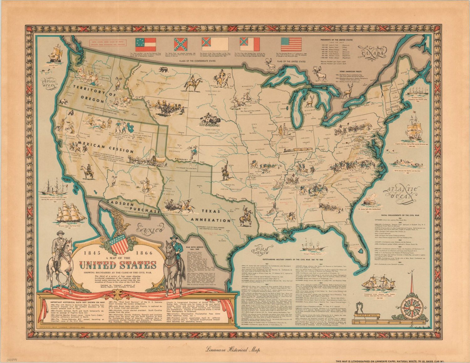 This map of the United States shows the country’s territorial expansion through the end of the Civil War; highlighting signification acquisitions and changes made between 1845 and 1866. Small vignettes within the map reflect events and features from the mid-1800’s, and lean heavily towards conflict in the Civil War and between Native Americans and white settlers. Text explaining the illustrations is also provided in many cases. Lists of outstanding military events and naval engagements of the Civil War are shown in the lower left, adjacent to the decorative compass rose and distance scale.