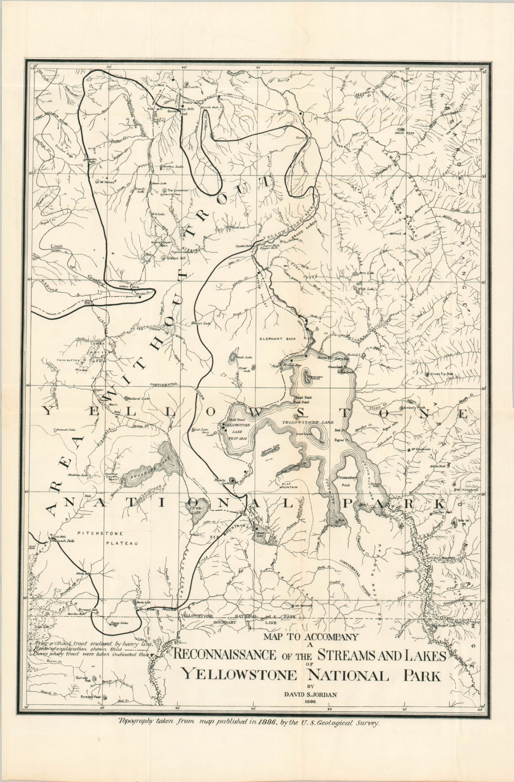 “In the summer of 1889, at the instance [sic] of Capt. F.A. Boutelle, U.S. Army, acting superintendent of the Yellowstone National Park, a brief visit was made to the Park by Hon. Marshall McDonald, U.S. Commissioner of Fish and Fisheries. It was made very evident from the observations of the Commissioner that much could be done towards enhancing the attractions of the great national “pleasuring ground” by the stocking of those of its various streams and lakes which are now destitute of fishes. In September, 1889, the writer was requested by the Commissioner to make a visit to the Park for the purpose of procuring exact data preliminary to the work of introducing trout and other fishes.” – David Star Jordan, Preface.