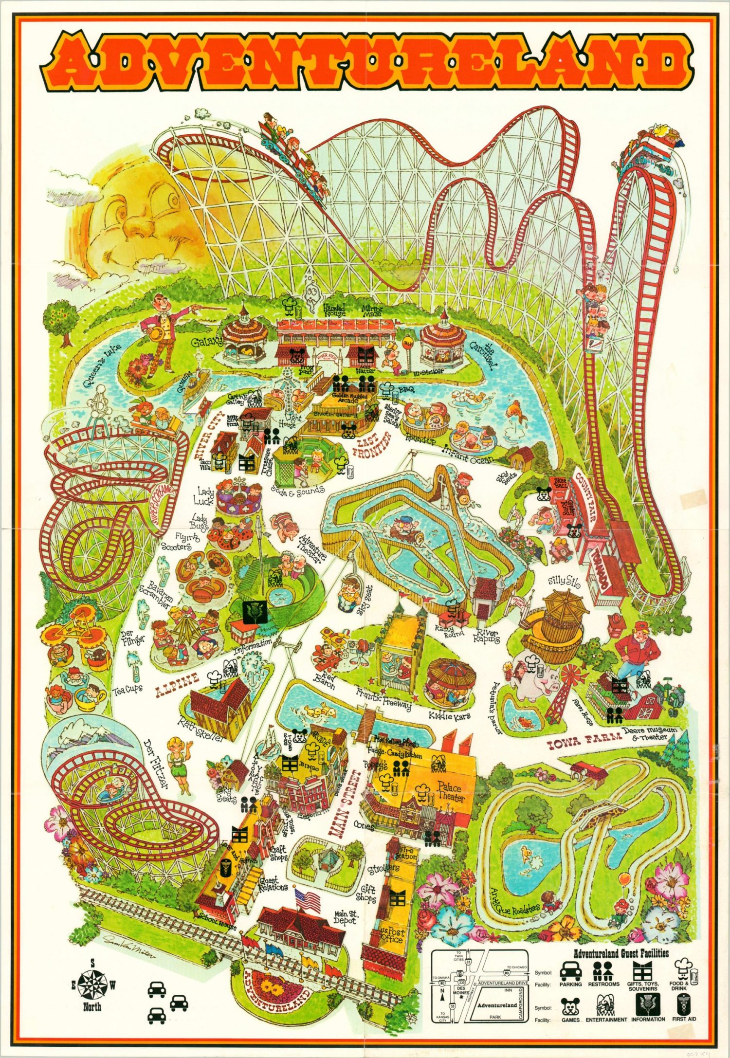 Although a tornado delayed the park’s opening in 1974, Adventureland has since been operating at a (relatively) uninterrupted pace and has expanded greatly since this c. 1981 view was issued. The cartoonish depiction shows the park shortly after it incorporated attractions from the closed Riverview Amusement Park in nearby Des Moines.