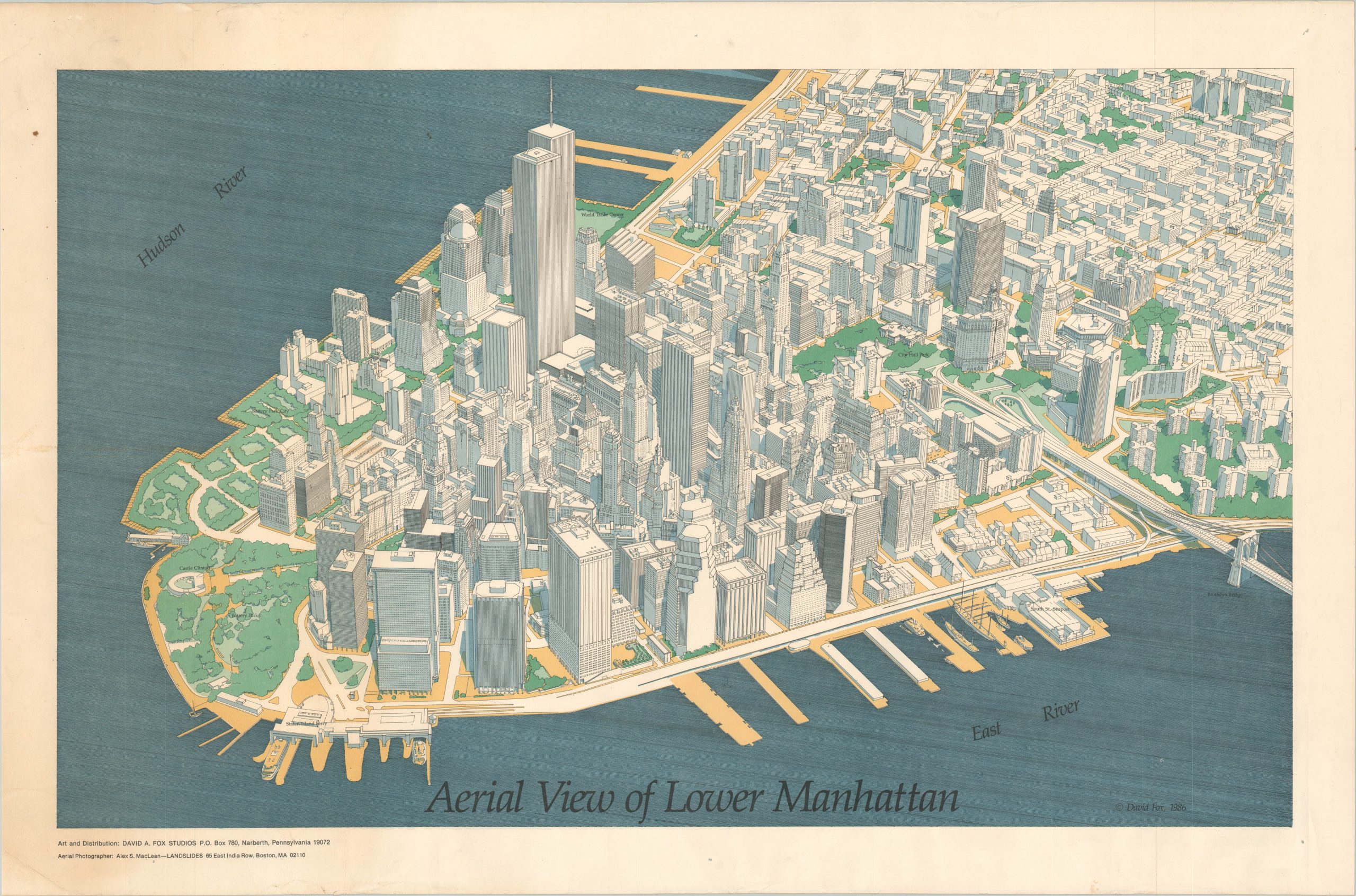 This isometric aerial view of Lower Manhattan presents a starkly illustrated depiction of the New York skyline in the mid-1980s. The rich architectural diversity of the heart of the Big Apple is on full display. Iconic monuments like the Brooklyn Bridge, the World Trade Center, and Battery Park are labeled, though scores of buildings are accurately depicted and unnamed.