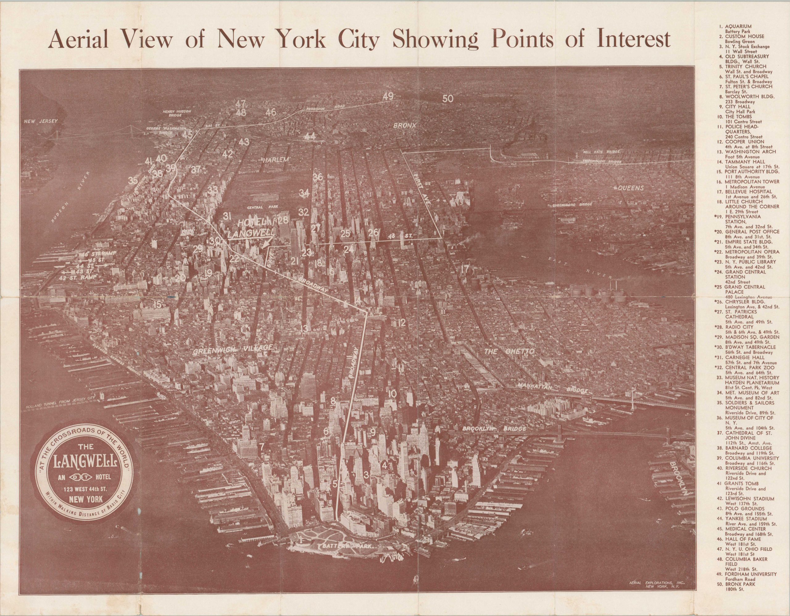 This impressive bird’s eye view of Manhattan was created by Aerial Explorations, Inc. for use in a c. 1938 advertising pamphlet for the Langwell Hotel. The building’s central location in Times Square is overlaid in white, along with primary transportation routes, fifty locations of interest (keyed on the right), and various neighborhoods.