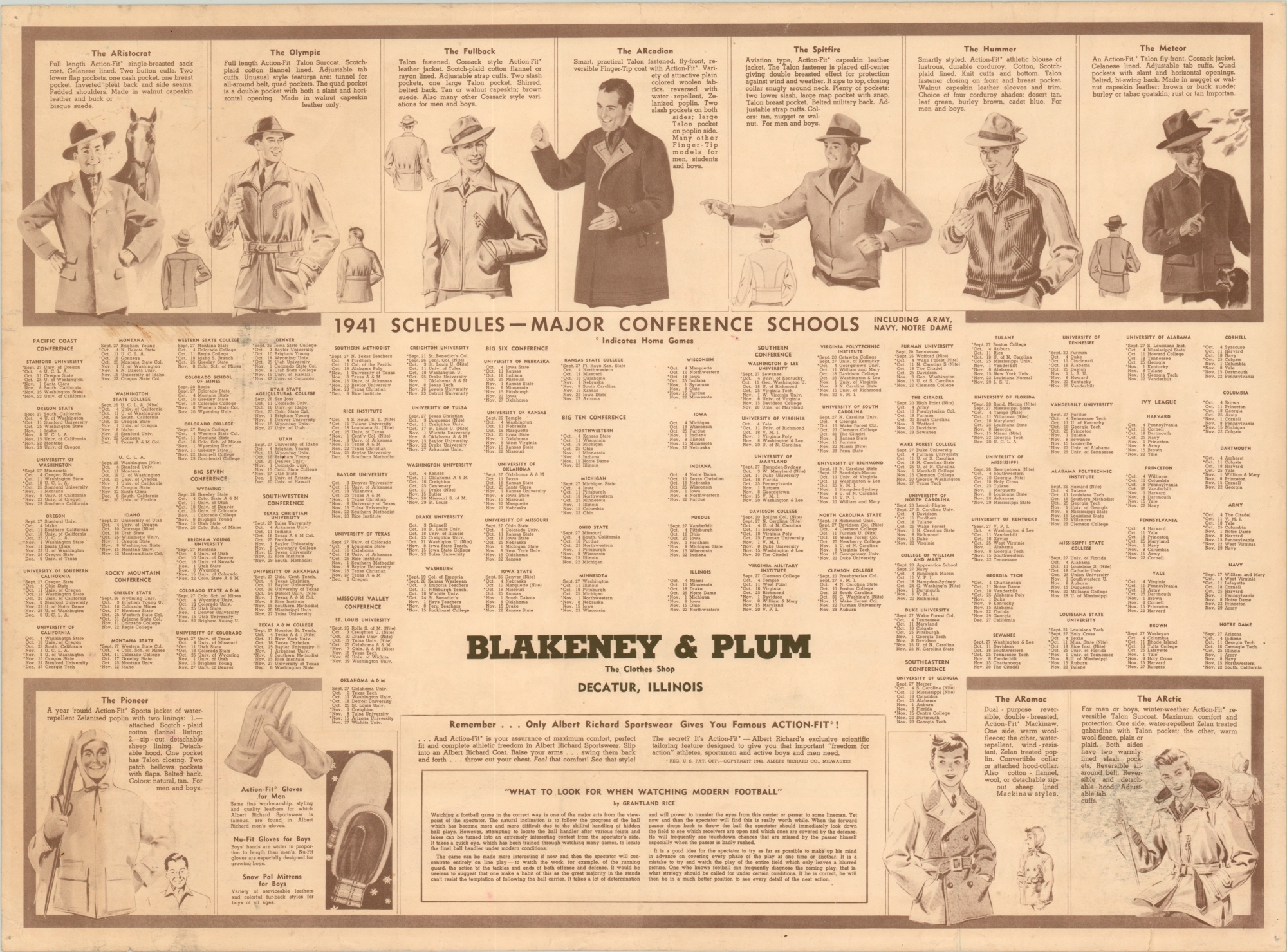 In addition to promoting football as a national pastime and spectator sport, the map was also produced to sell menswear for The Albert Richard Clothing Company of Milwaukee, Wisconsin. Several advertisements for coats and gloves – essentially clothing for watching football in cold winter weather – can be seen on the verso.