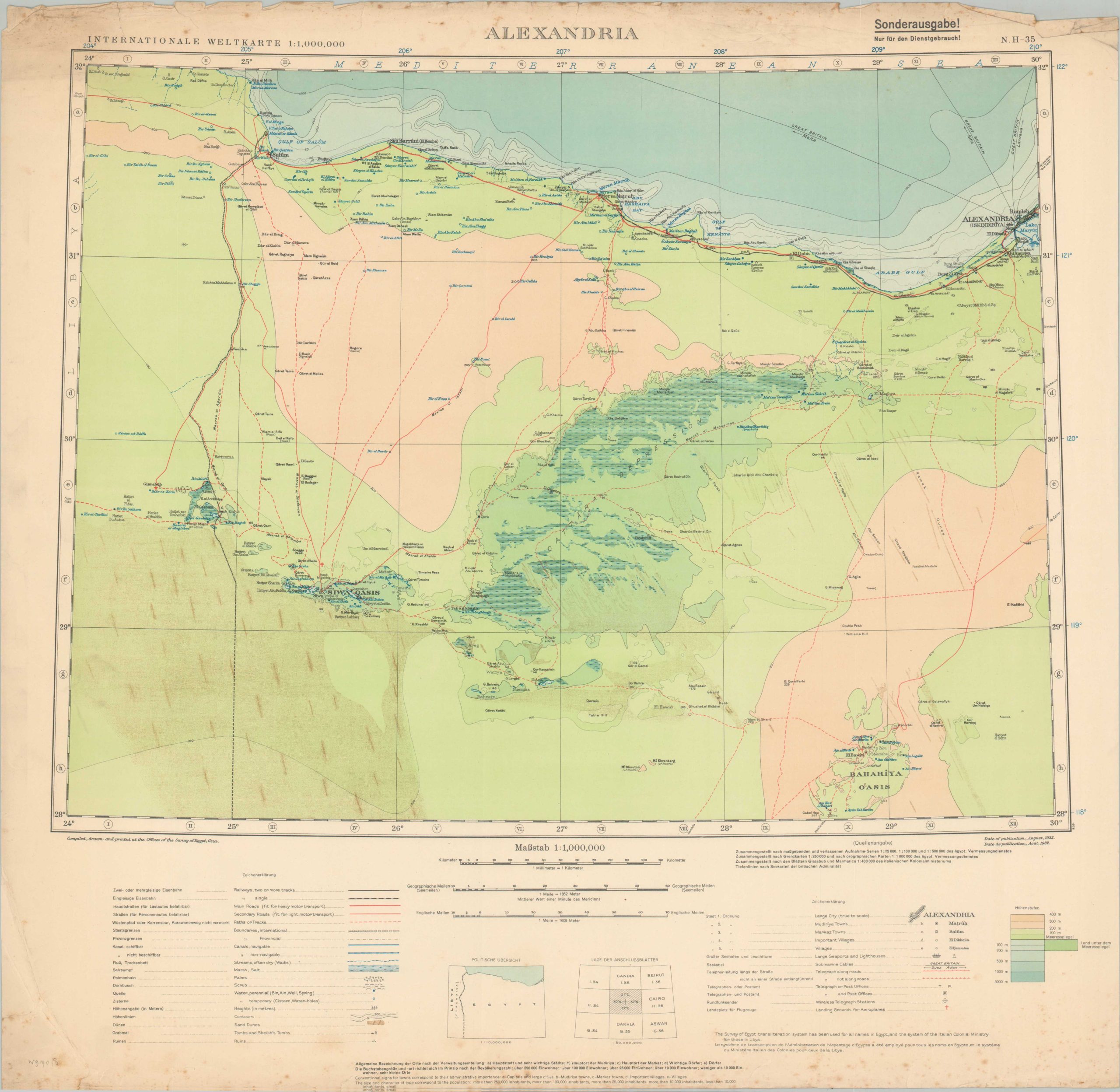 German military map focused on the port city of Alexandria and the surrounding area in northern Egypt. Published in Berlin by the German Army General Staff Directorate for War Maps and Surveying in 1941 as part of the Internationale Weltkarte [International World Map] series. Stamped Special Edition! For Official Use Only!