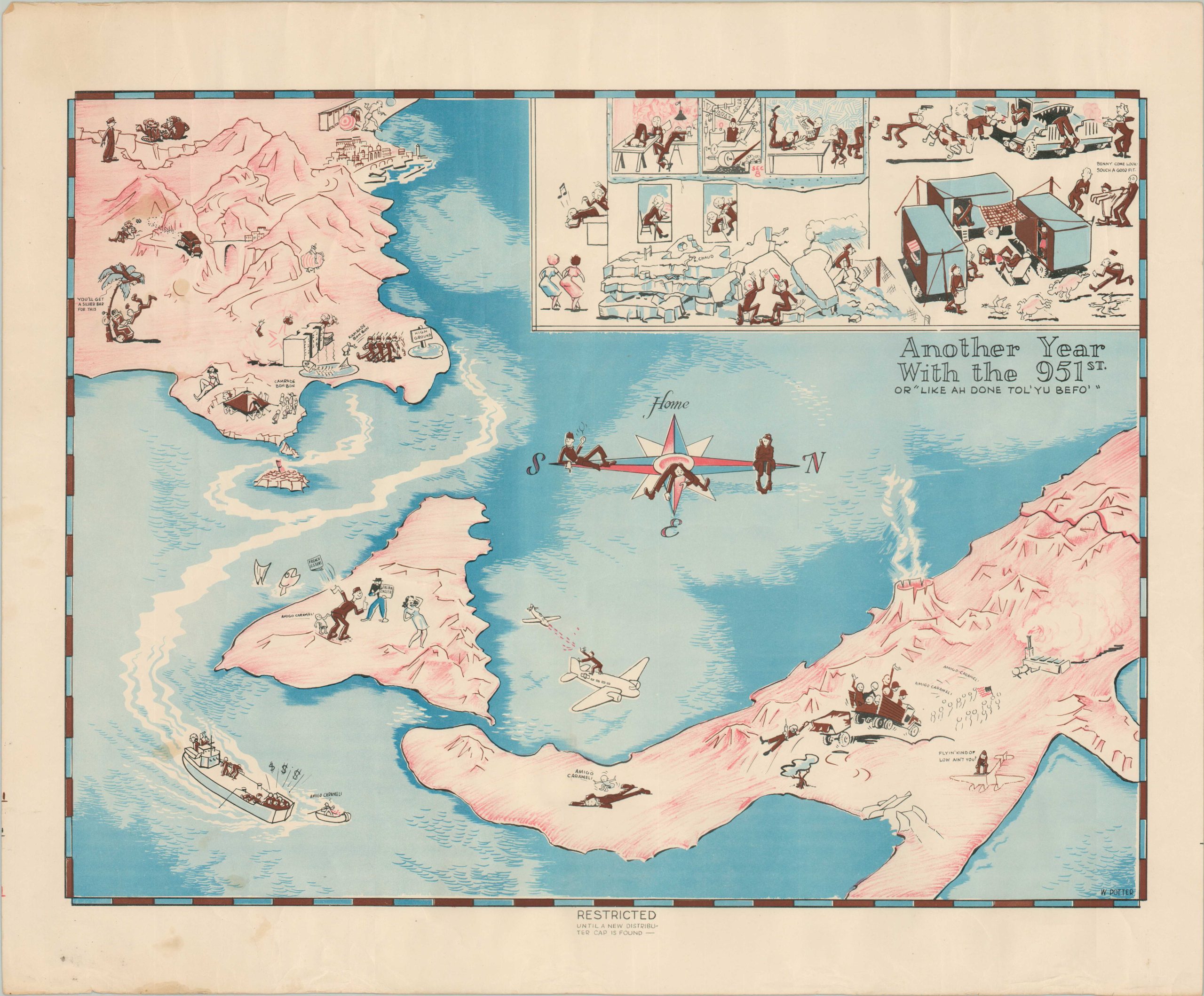 This lighthearted commemoration of one unit’s WWII campaign in North Africa, Sicily, and Italy was drawn by W. Potter of the 951st Aviation Engineer Topographic Company. This small and specialized group (likely no more than 500 men) would have been responsible for using a variety of sources (mostly aerial photography) to create navigational and target charts for the Air Corps. This important work is overlooked in favor of a humorous image that tells more of the amusements of war than of its dangers.