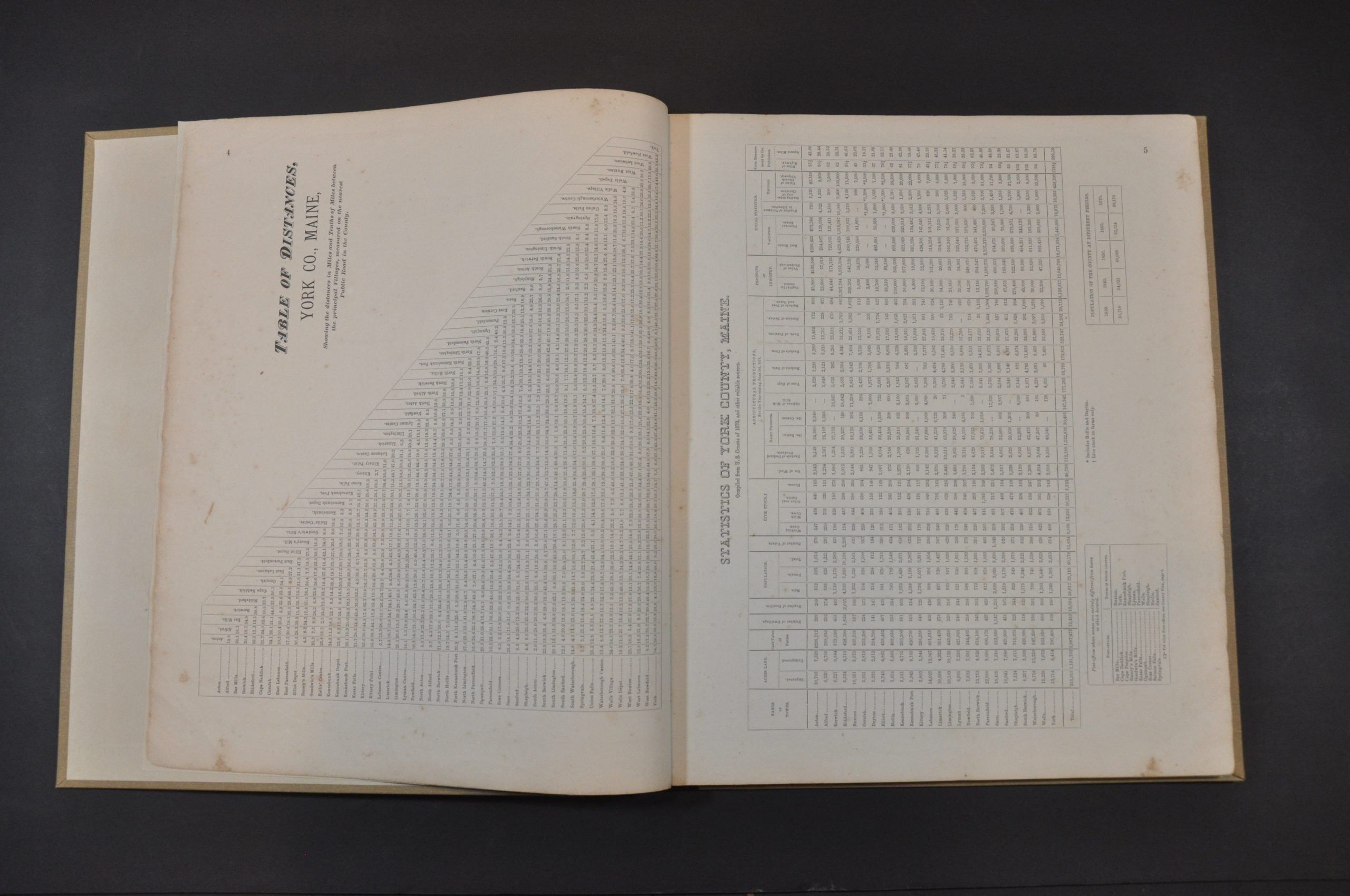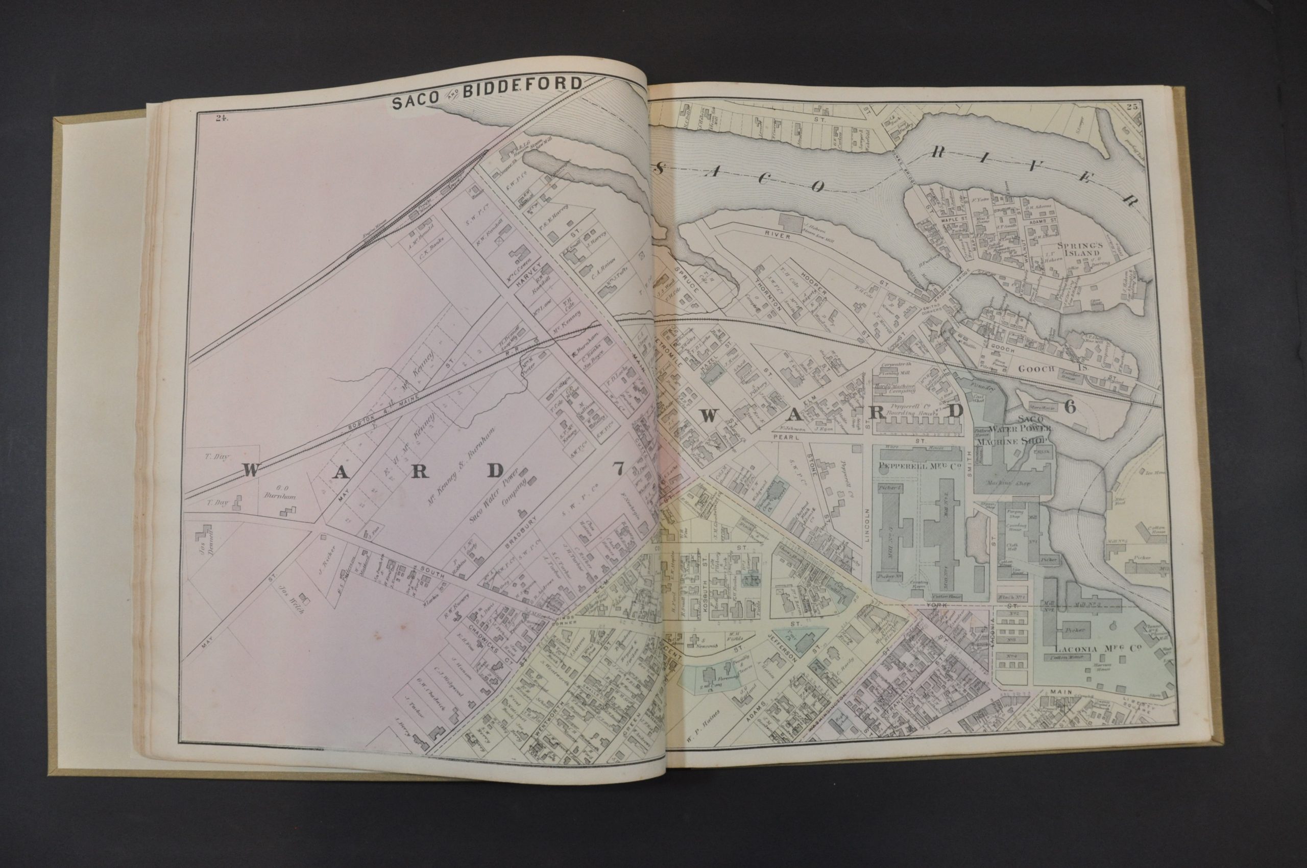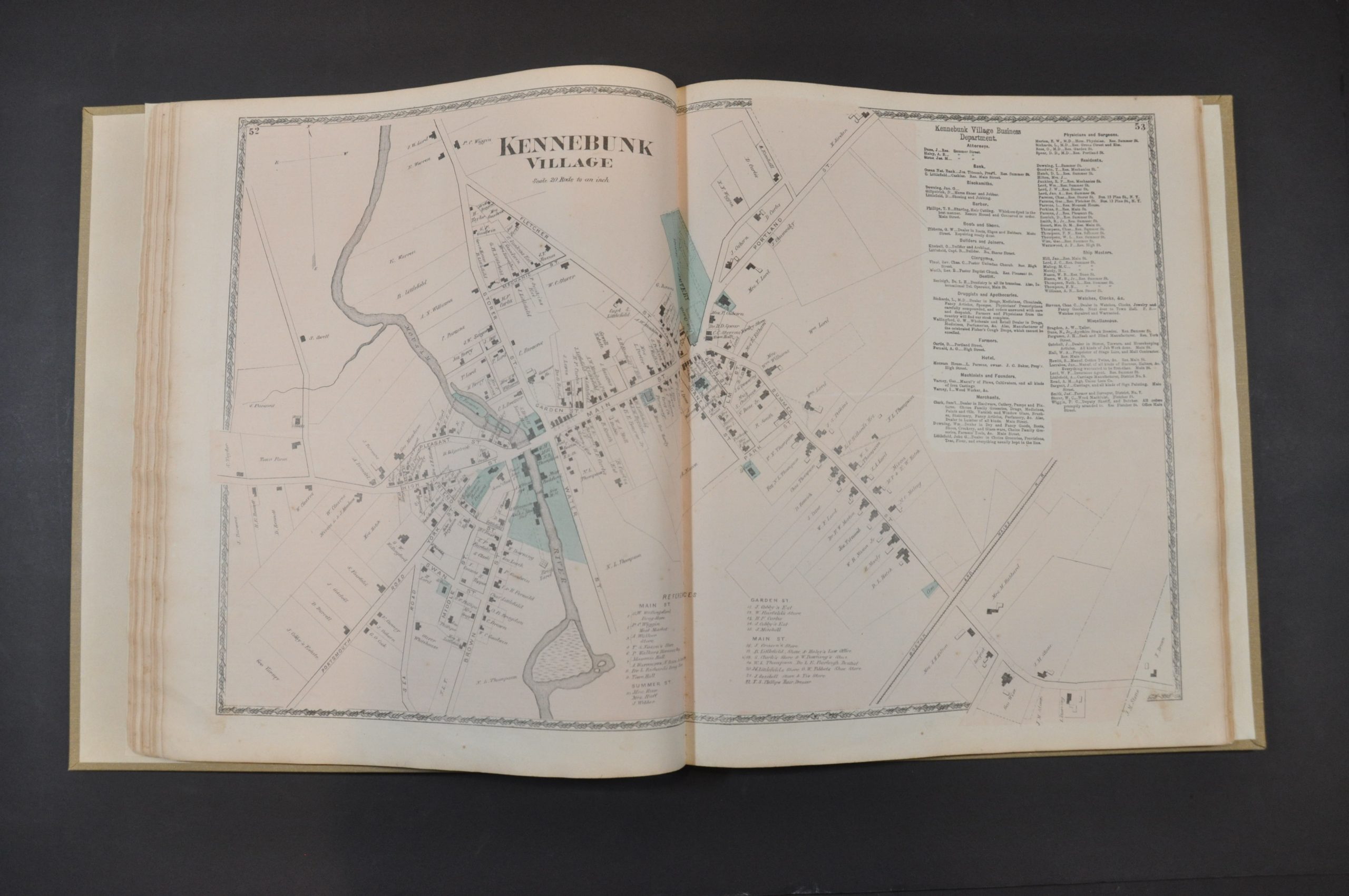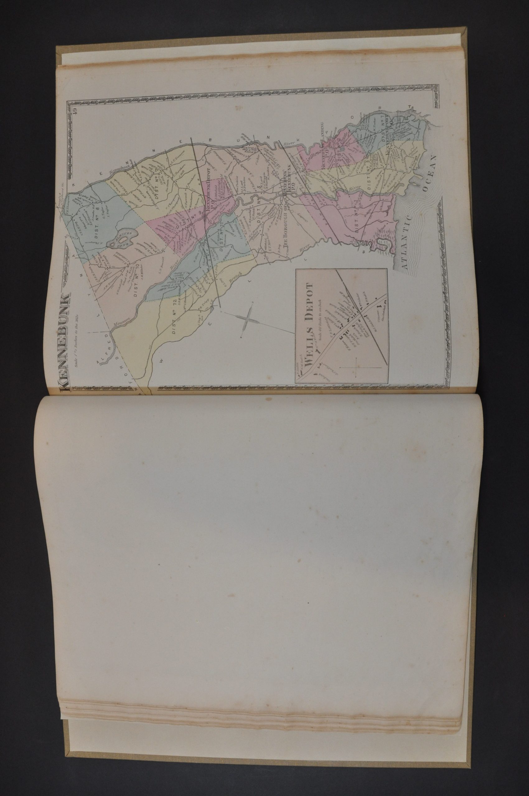 A table of distances and a chart of population statistics is followed by a double-page outline map of the county. The image notes transportation routes, settlements, post offices, and geographic features – including the numerous lakes and hills that dot the region. This is followed by 14 double-page and 30 single-page maps of townships, village street plans, and city wards. The majority of these provide information on land ownership, property divisions, public areas (parks, cemeteries, etc.), and important buildings. Of particular interest is the five-sheet plan of Biddeford and Saco.