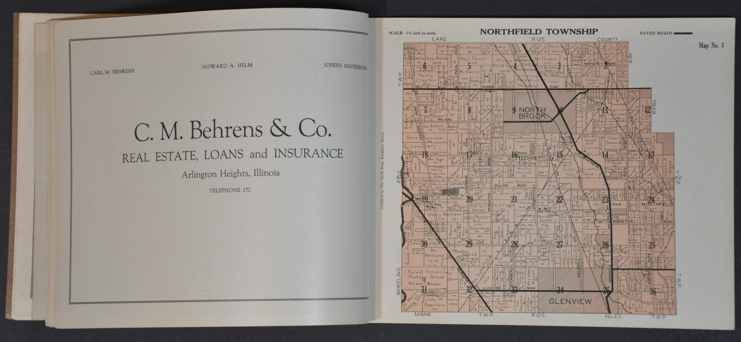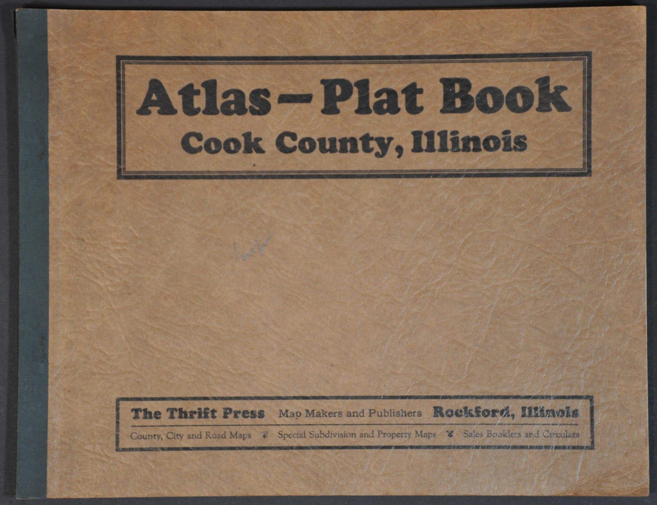 The Thrift Press was one of several local publishers operating in Rockford during the 1920s. Their output focused on ‘County, City, and Road Maps, Special Subdivisions and Property Maps, and Sales Booklets and Circulars’, according to text on the front cover. The works on uncommon on the market and in institutional collections – only two examples of this 1927 Cook County Atlas are in WorldCat (a 1926 edition is also listed) – at the Galesburg Public Library and the Abraham Lincoln Presidential Library.