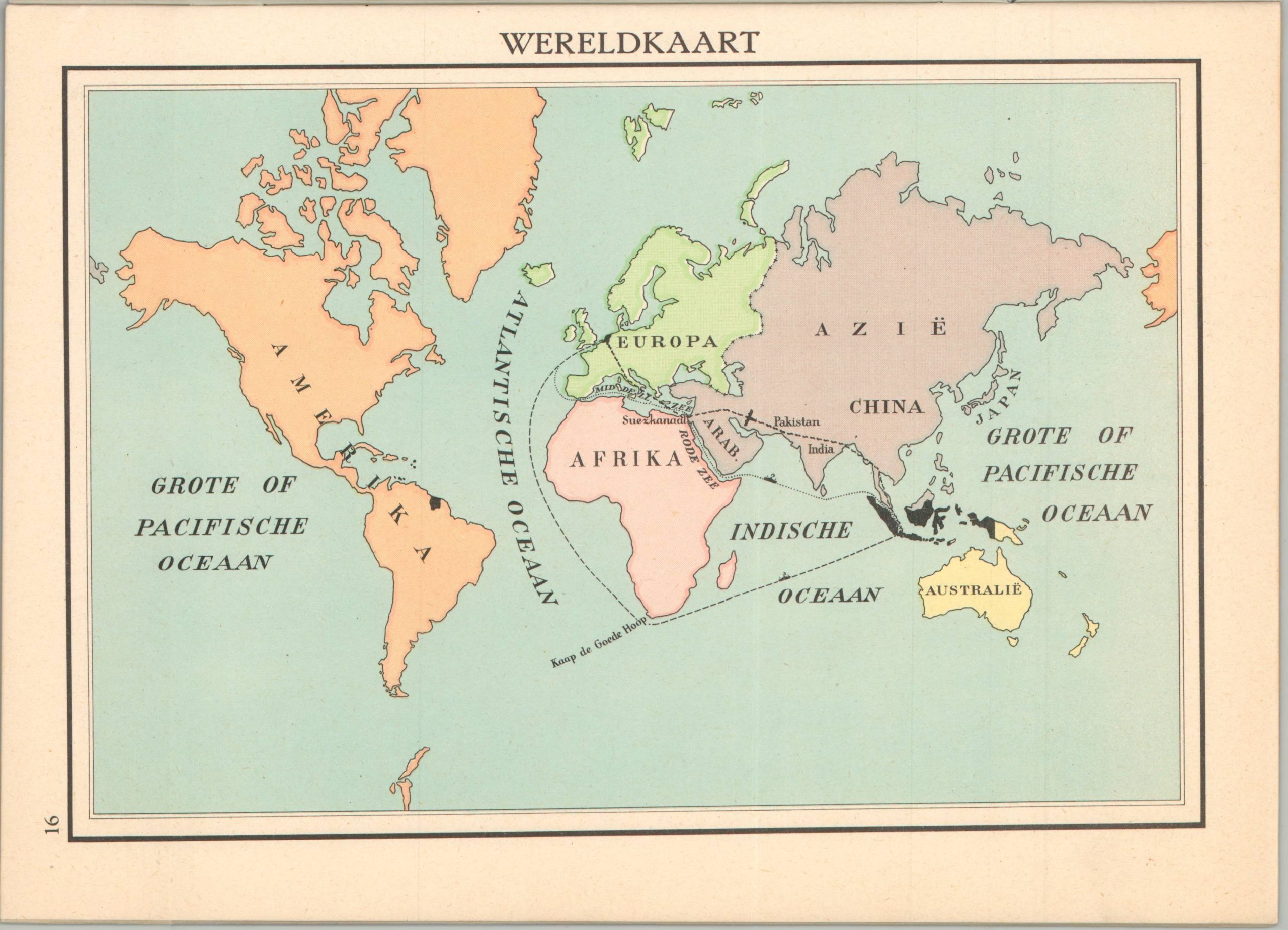 The map of Indonesia is notable for still using mostly Indonesian toponyms (with the exception of Batavia) and showing further European enclaves, including the British in Brunei, the Portuguese in East Timor, and the French in Vietnam (Cochin-China). The world map shows primary transportation routes between the Netherlands and its former colonies in Southeast Asia, as well as its remaining overseas territories in Dutch Guiana. According to a fascinating analysis on school atlases published for the Dutch East Indies,