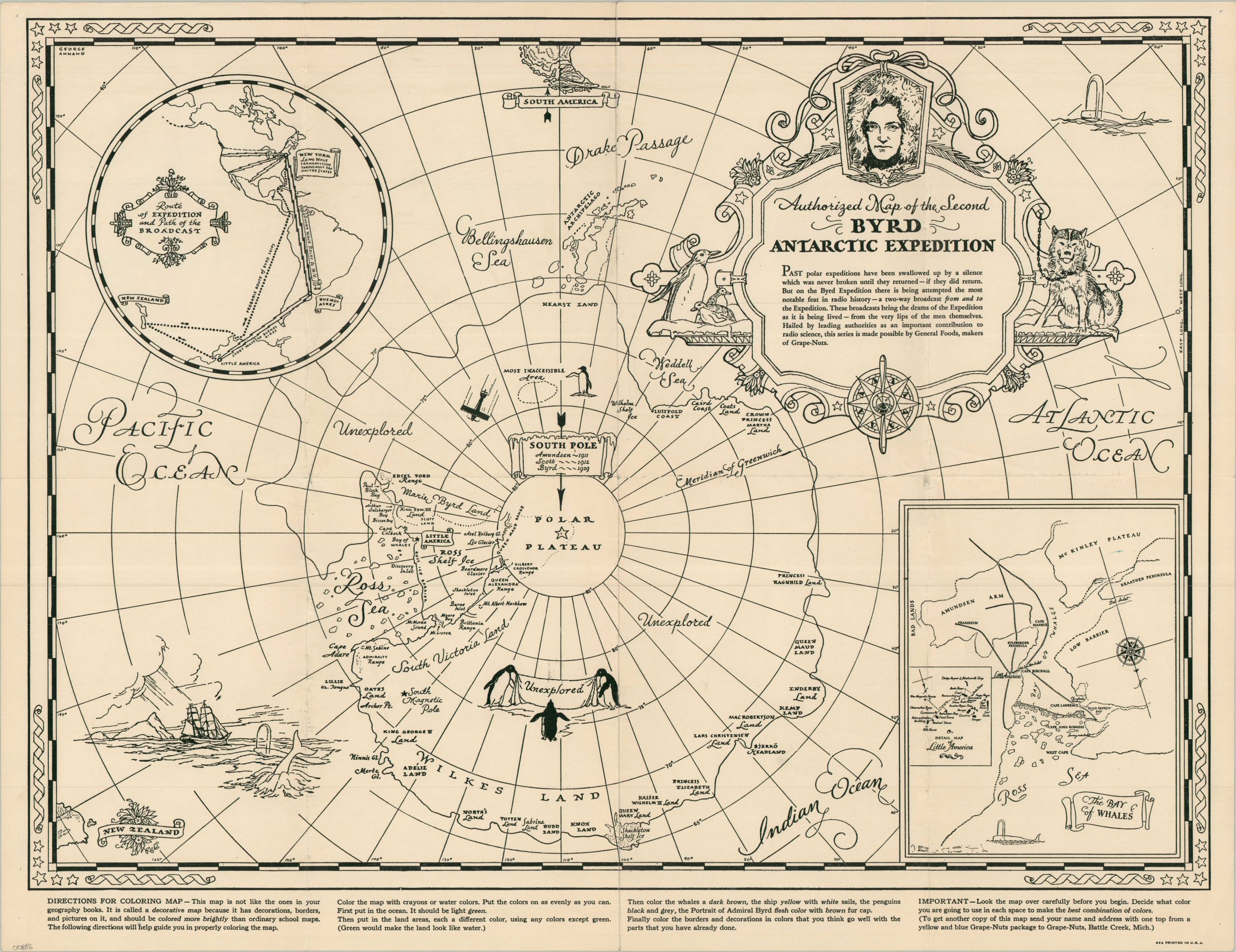 This lively black and white polar map was illustrated by the talented George Annand and published in 1934, during the Second Polar Expedition (1933-1935) led by Admiral Richard E. Byrd. It depicts Antarctica from a polar perspective, with the tip of South America visible at the very top of the image. Large areas are labeled as unexplored, inaccessible, or “claimed.” Inset maps of Byrd’s route south and the area near his camp are provided to the audience as a helpful aid. As explained in the decorative title cartouche, Byrd’s second expedition was the first to feature live two-way radio broadcasts. A radio station sponsored by CBS was set up on the base camp ship and relayed weekly updates to New York via Buenos Aires. Grape Nuts were among the provisions brought by Byrd and his team, hence the partnership with General Foods.