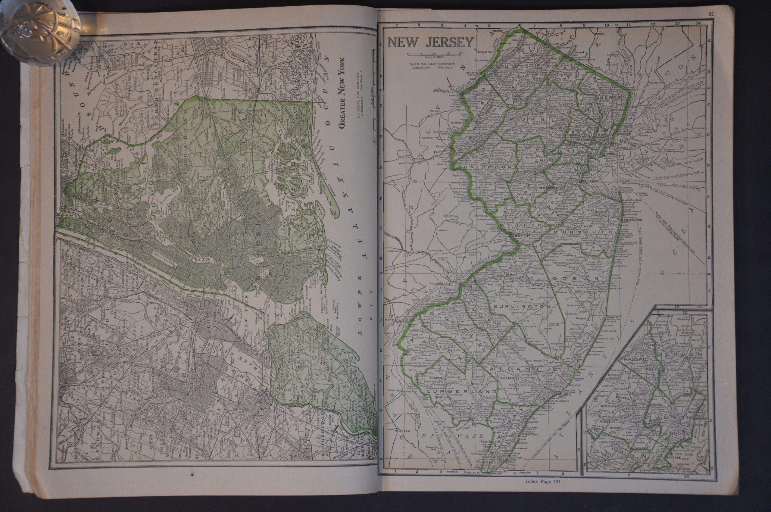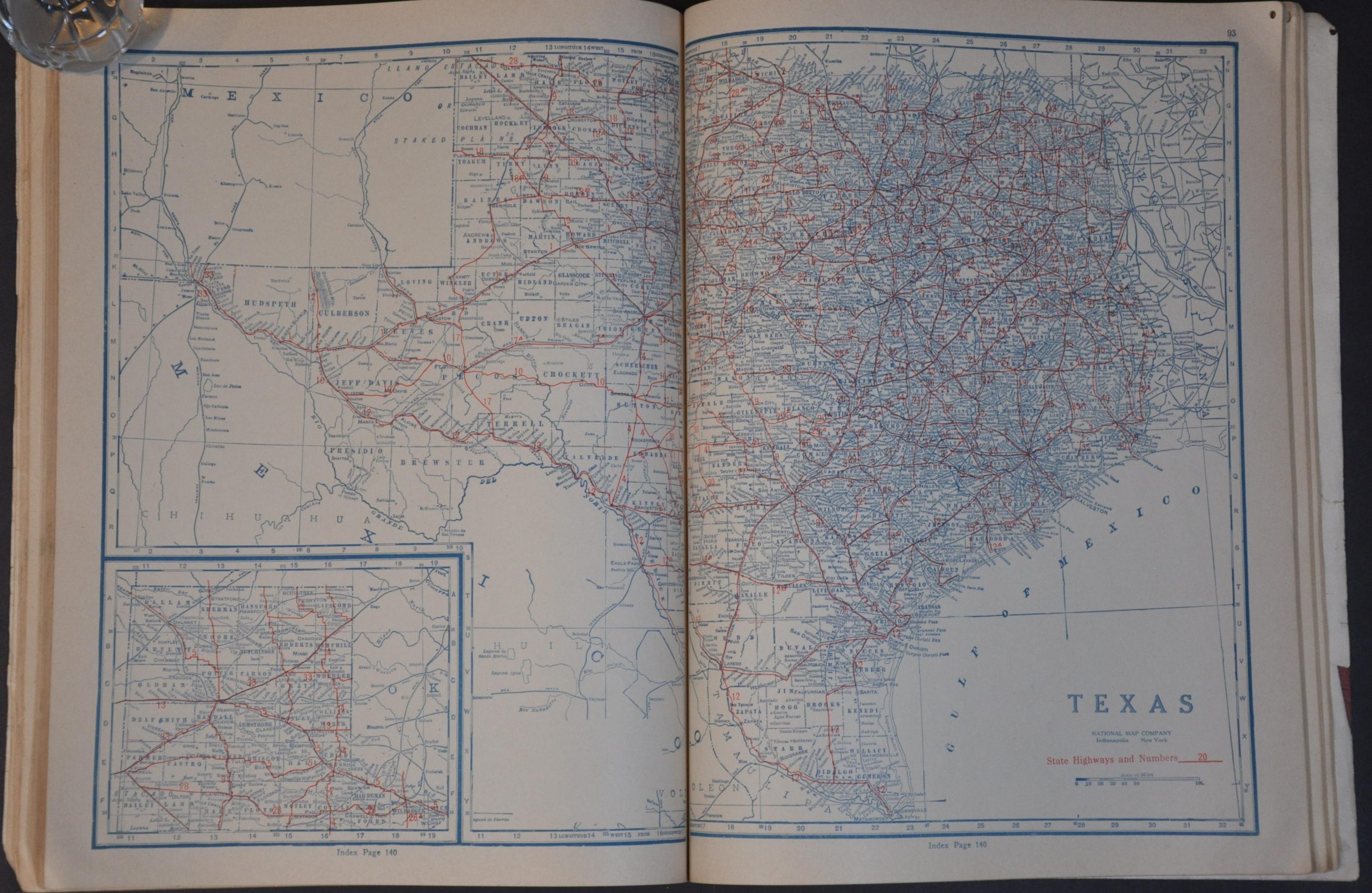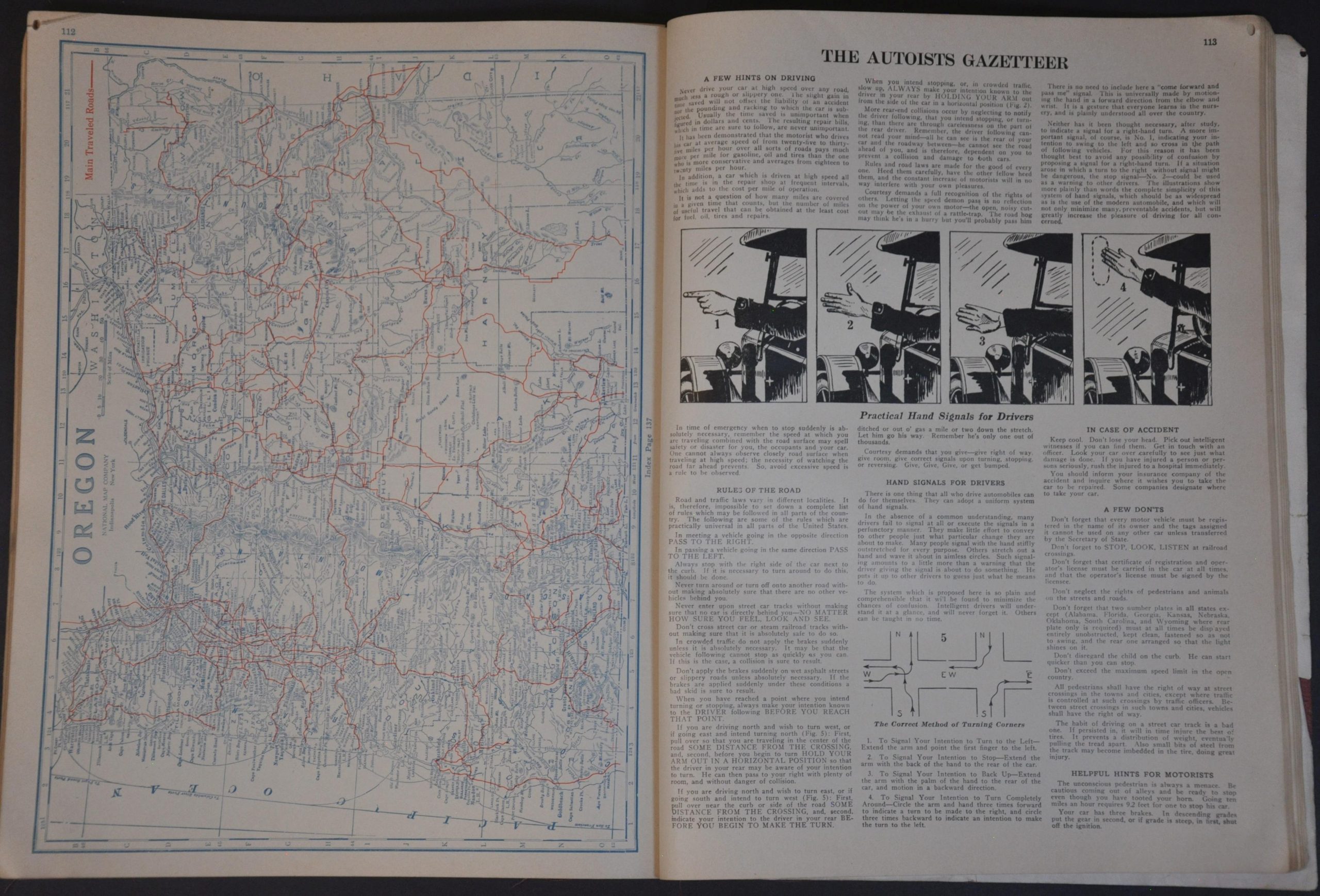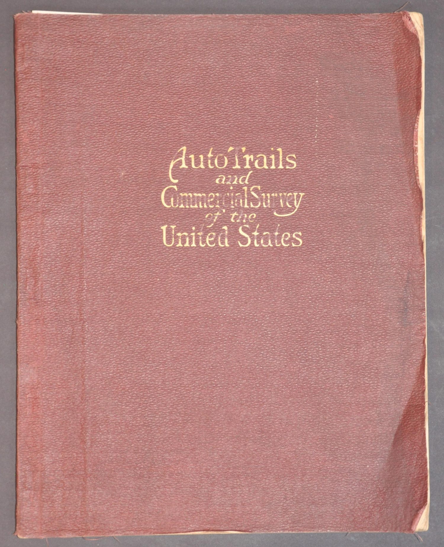 This intriguing highway atlas of the United States was published by the National Map Company around 1922 (undated officially, but the National Parks map shows a date of 1921). Issued before the nationwide introduction of the Numbered Highway System, the contents reflect a patchwork assortment of public and privately sponsored named automobile trails (though some states had adopted independent numbering systems by the time of publication). These commercially-oriented routes were generally marked by signs on utility poles – nearly such 50 route markers are shown in full color after the table of contents. Both automobile and commercial maps of all 48 states are included, along with a map of national and transcontinental highways, list of motor vehicle laws, plan of Greater New York, and an informative ‘Autoists Gazeteer.’
