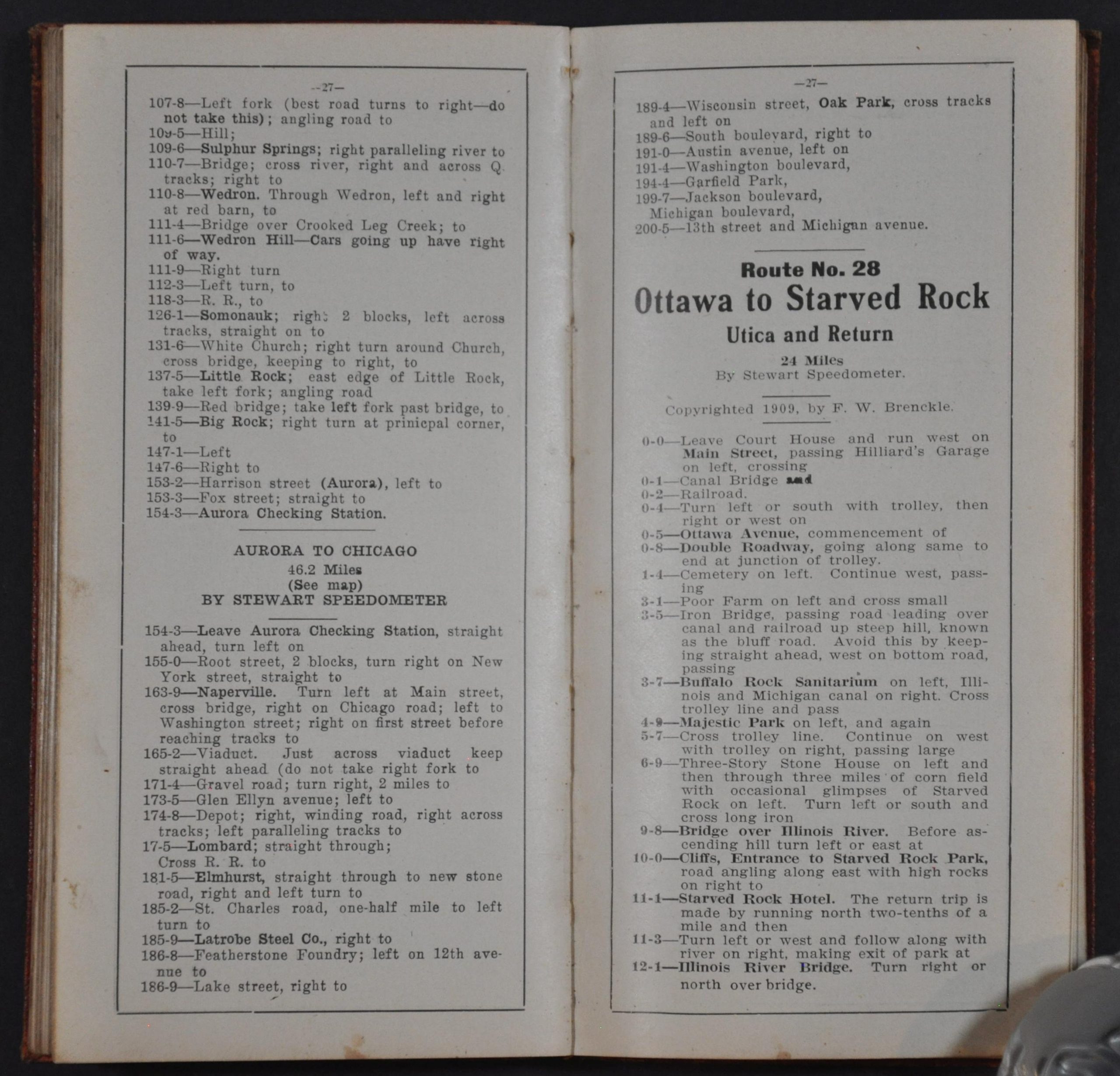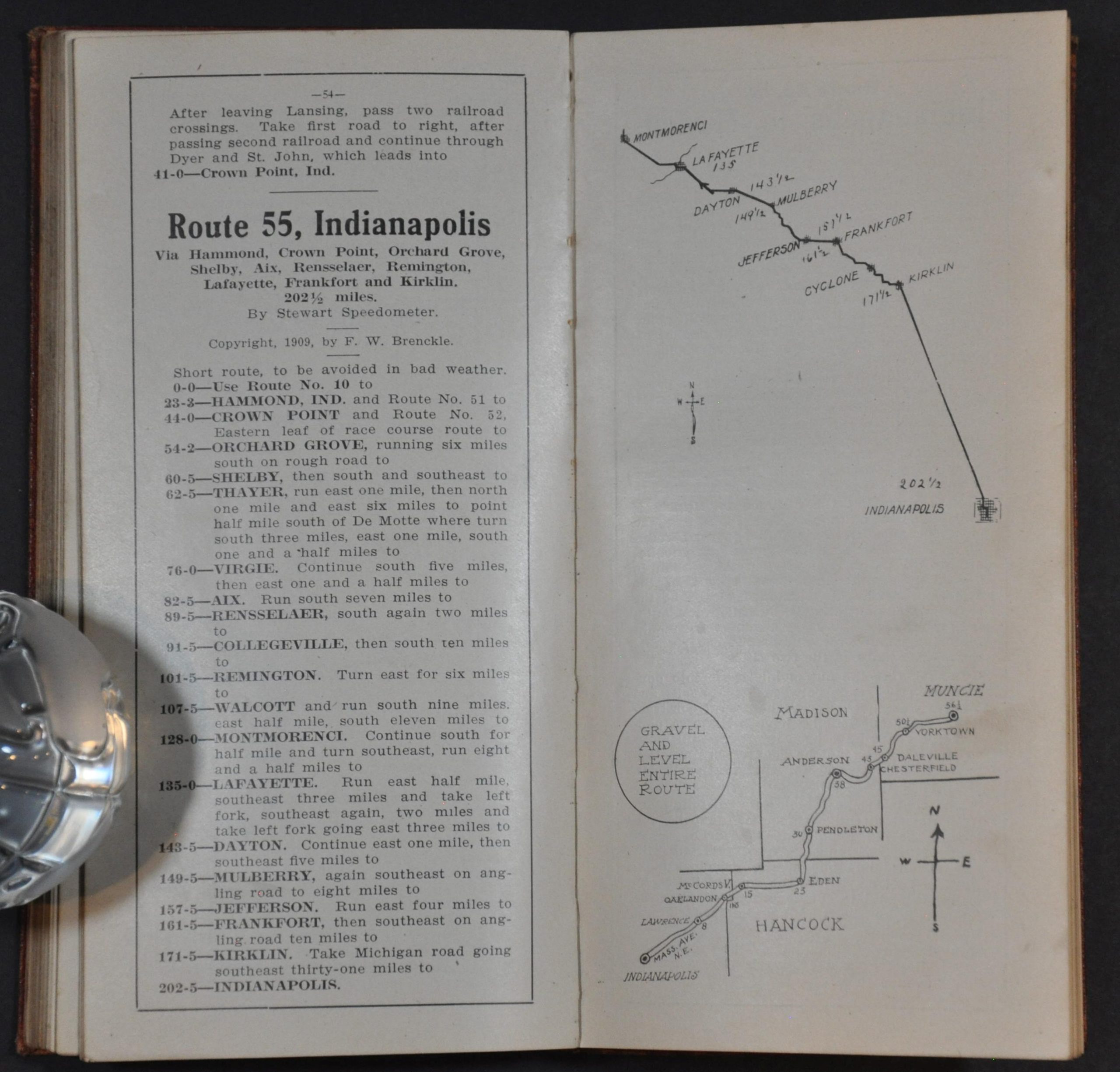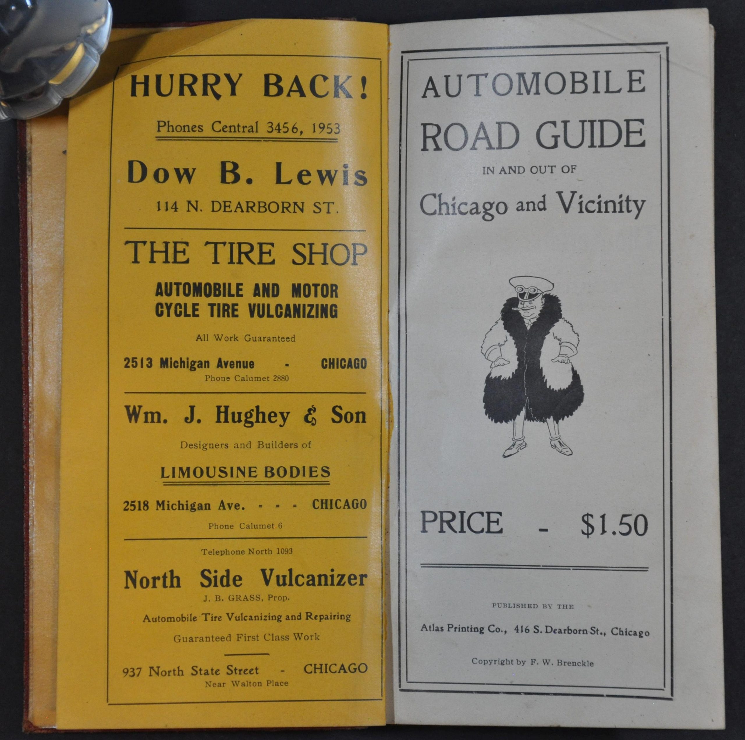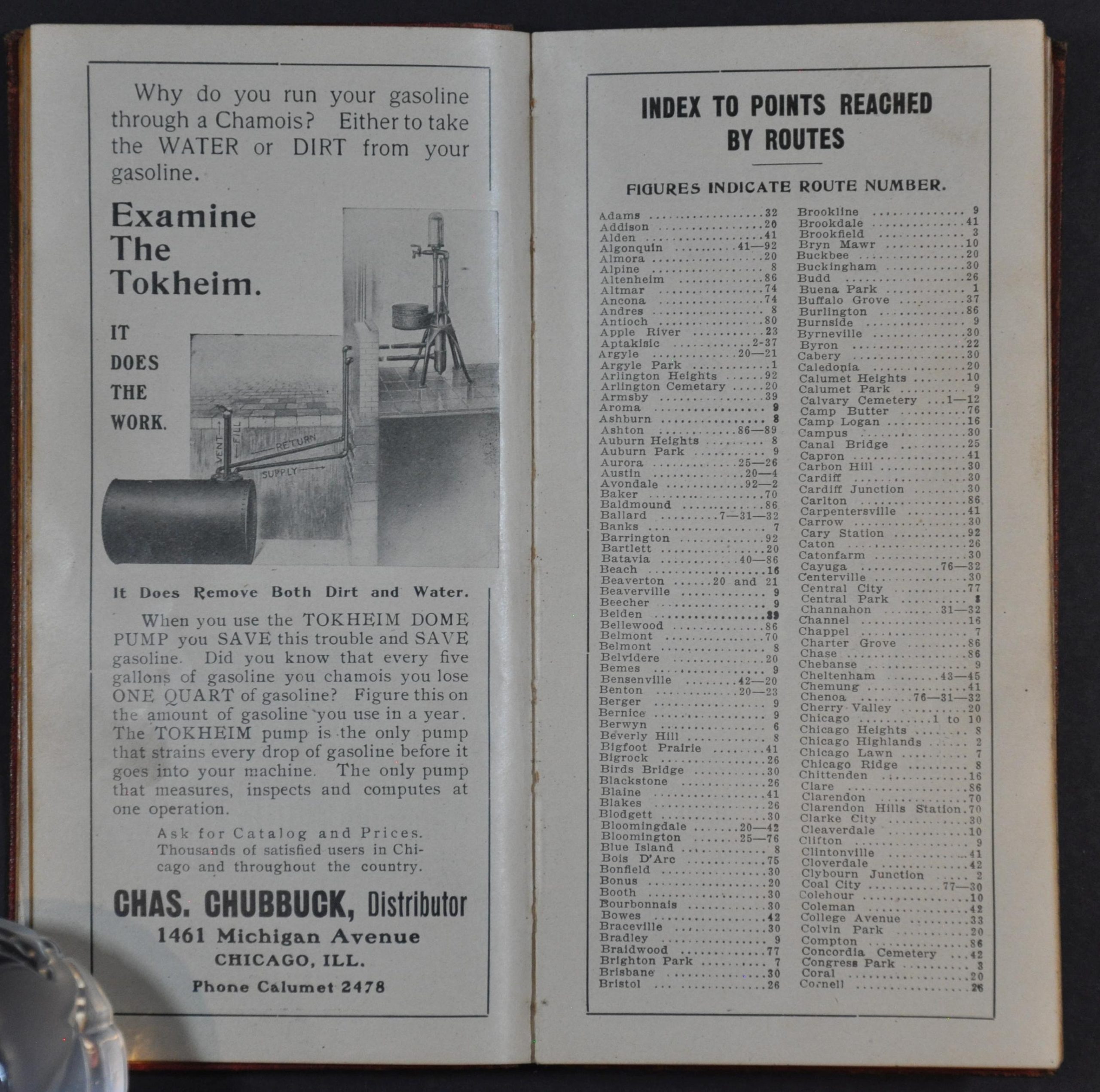 This convenient and informative road guide to the area around Chicago was copywritten in 1909 by F.W. Brenckle and published locally by the Atlas Printing Company. An introduction outlining state motor laws is followed by an index listing 100 different curated routes extending to Indianapolis, Lake Geneva, Iowa City, Green Bay, Starved Rock, and many other Midwestern destinations. These are provided in the form of turn-by-turn directions and accompanying mileage, accompanied by a very rudimentary sketched map. The maps sometimes offer information on the road surface (paved, dirt, etc.), but more often than not, simply present an uninterrupted line connecting each point.