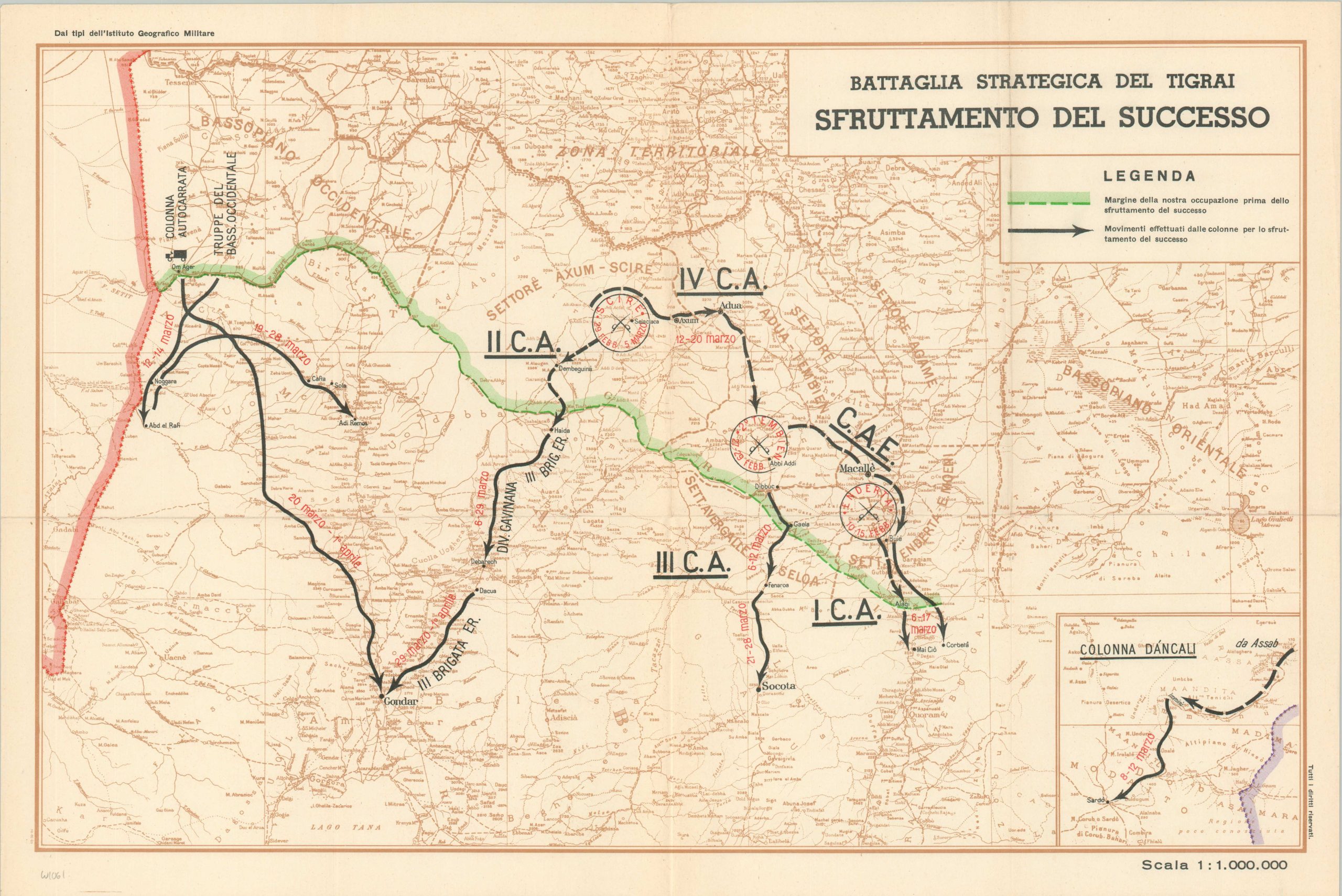 This battle plan highlights how the Italian Army under Pietro Badoglio exploited the success of initial advances into the Tigray region during the opening weeks of the conflict. The border of the Colony of Eritrea is marked in green, with southward movements shown through March and early April shown in black arrows. An inset in the lower left notes the route of the Ancali Column.