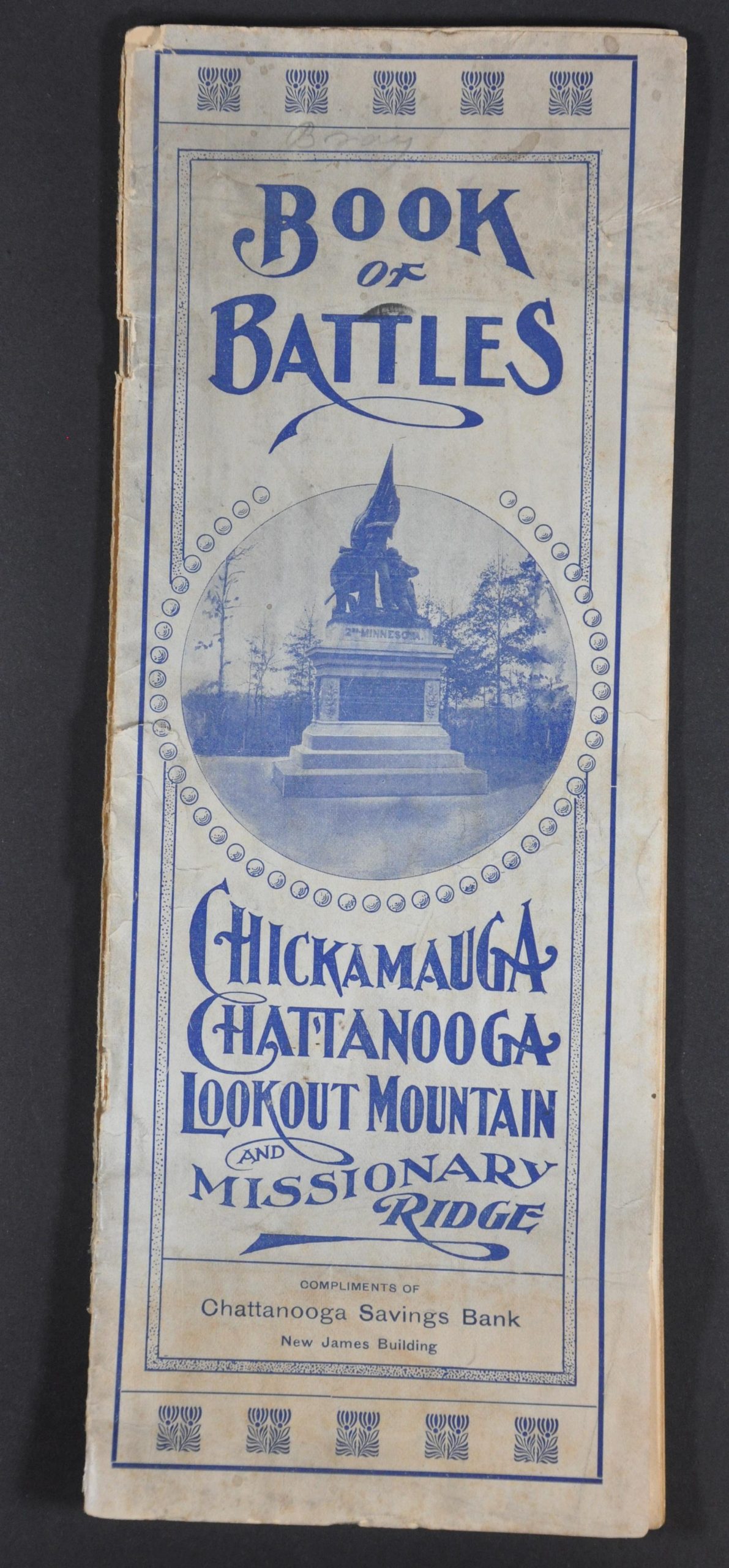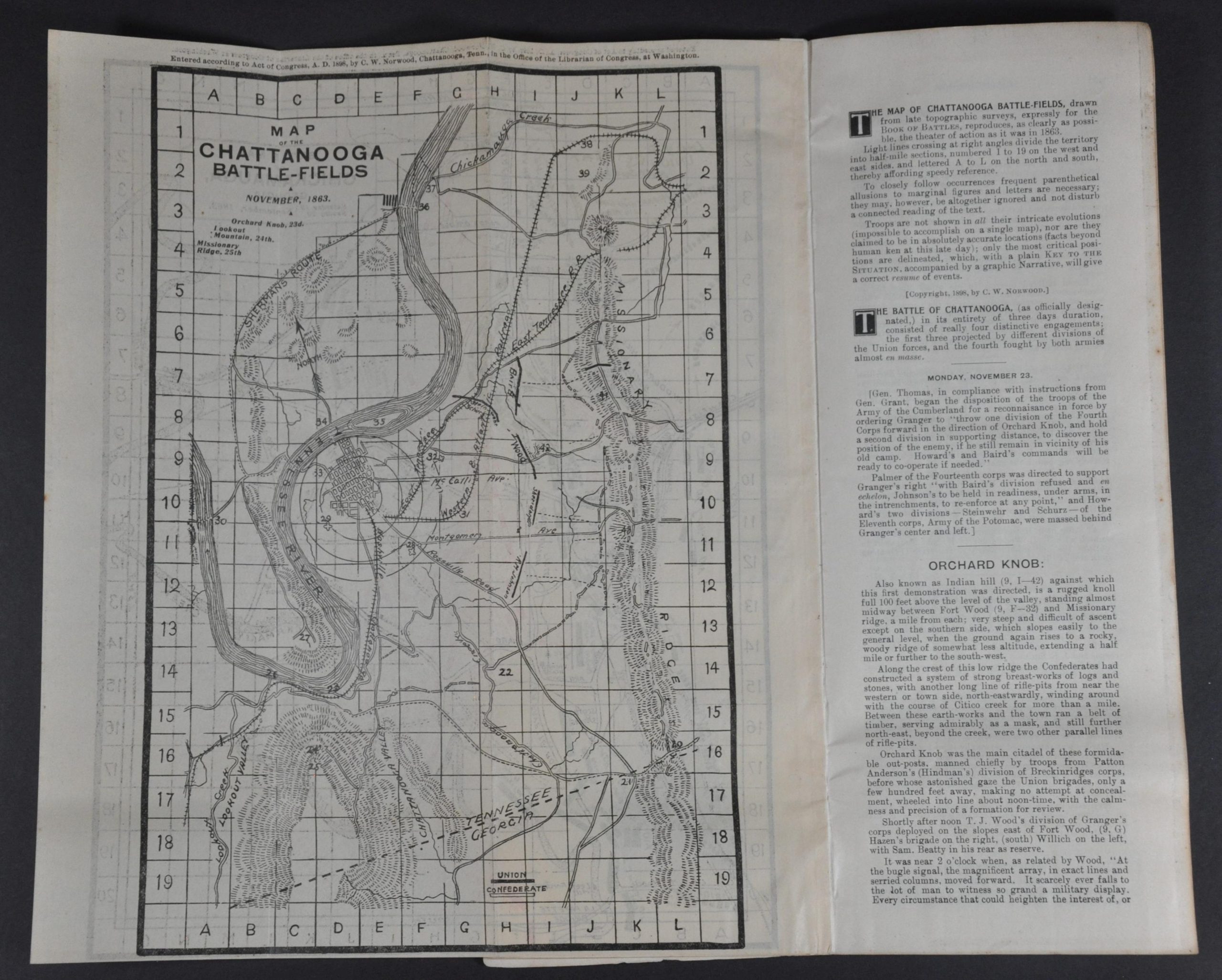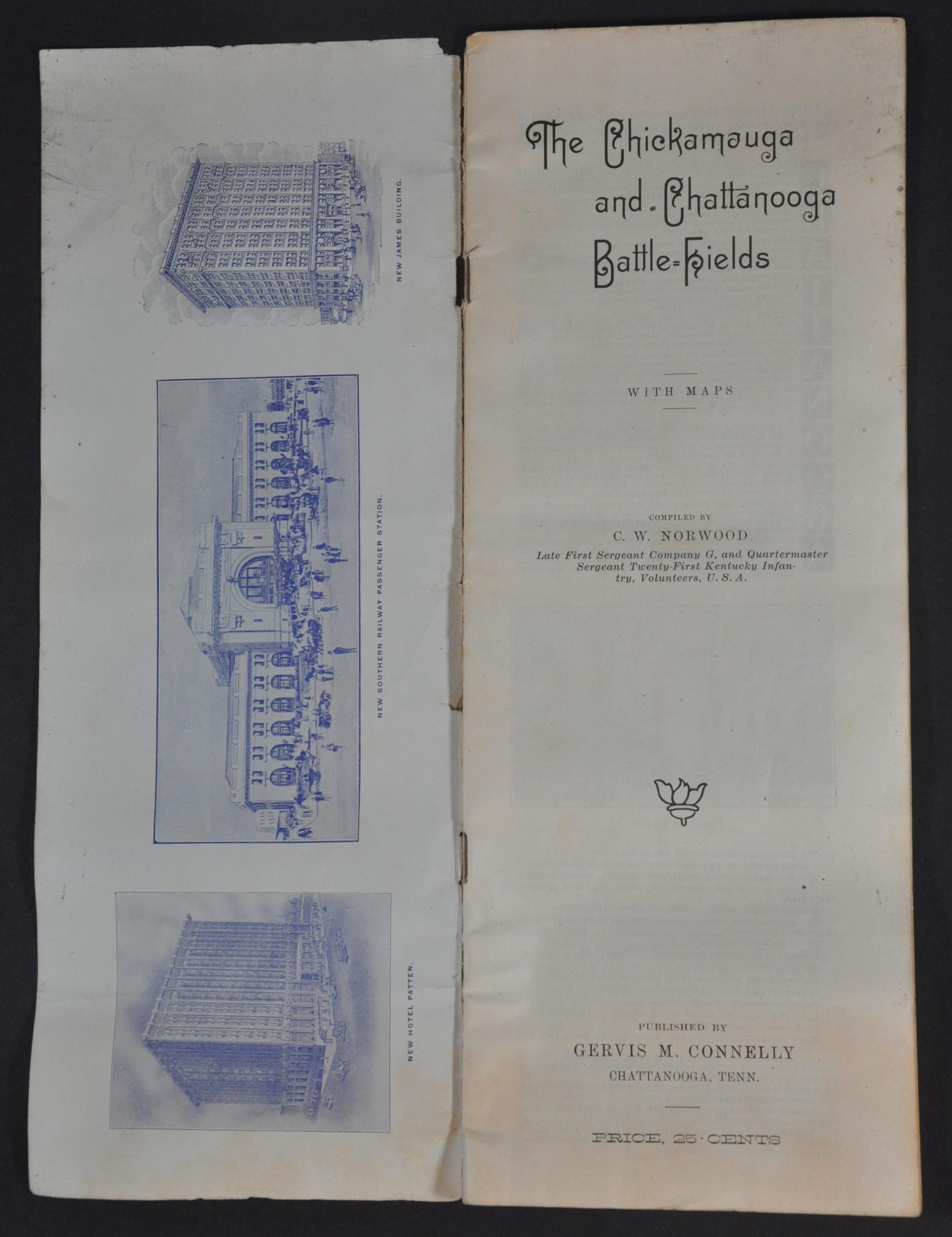 This interesting booklet was compiled by C.W. Norwood, a late veteran of the Twenty-First Kentucky Infantry, and published in Chattanooga, Tennessee by Gervis M. Connelly in 1908. It was issued compliments of Chattanooga Savings Bank to tourists and residents interested in local Civil War history. The contents begin with a brief description of Chattanooga; noting the pleasant climate, local amenities, and relevant demographics (e.g. 80% white, 90% American-born).