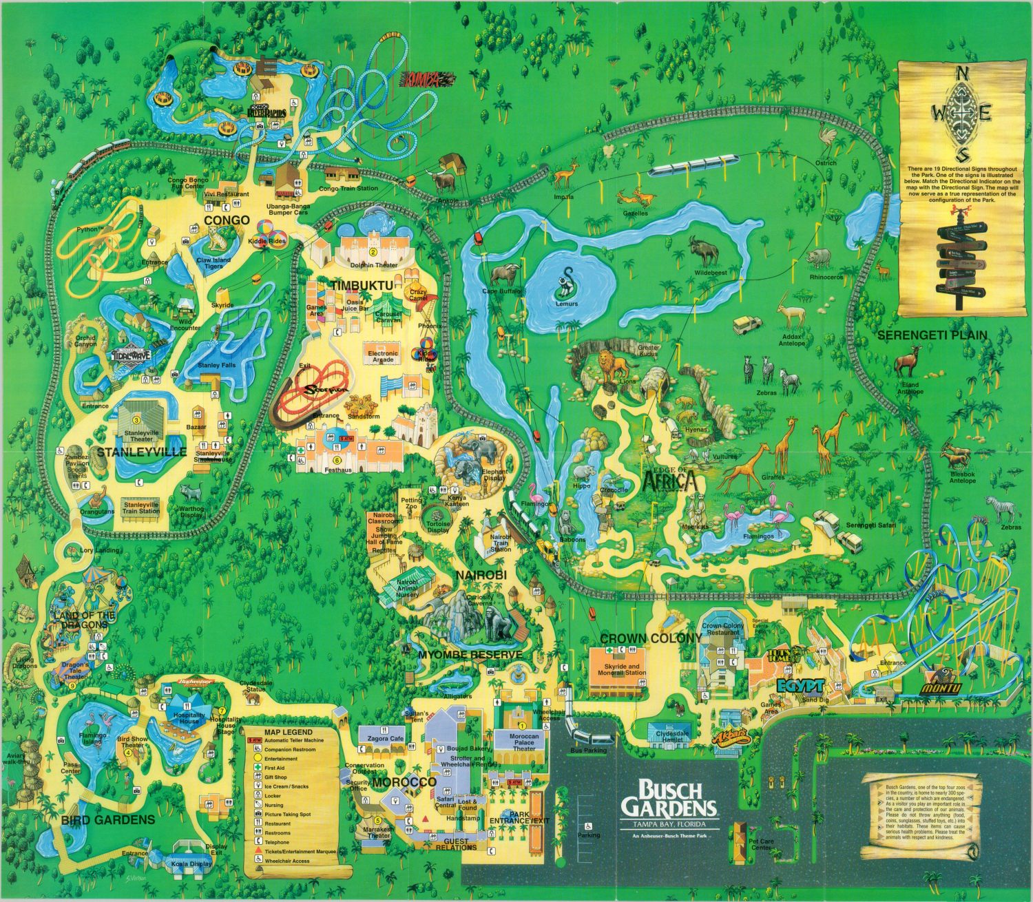 This souvenir map was distributed to parkgoers for the 1996/97 season. Various rides, guest amenities, and food options are illustrated and labeled. The latest attraction, Edge of Africa, opened the same year as publication and is featured prominently in the center of the page. A warning in the lower right reminds guests not to throw food, coins, sunglasses, or stuffed toys to the animals.