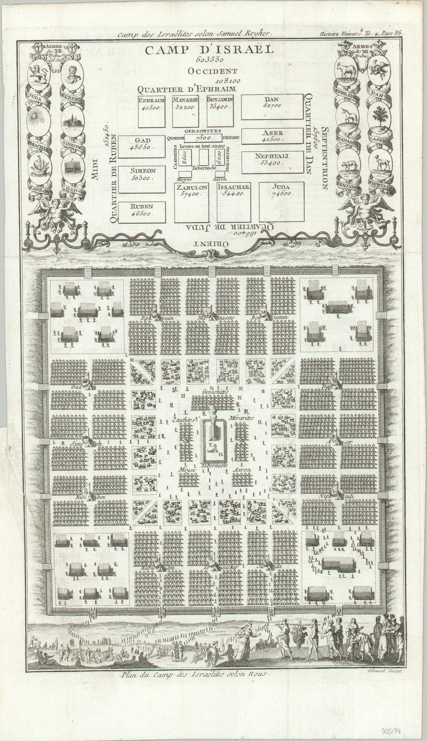 It shows a schematic and pictorial representation of the Twelve Tribes of Israel, situated around the Tabernacle after the Exodus from Egypt. The upper half presents the coats of arms (assigned around the 12th century), as well as the respective population of each tribe – totaling about 600,000 Israelites. The lower portion of the sheet shows an illustrated perspective of the encampment, with a few artistic liberties taken in the depiction of livestock enclosures, an encircling wall/ditch, and what appear to be groups of soldiers.