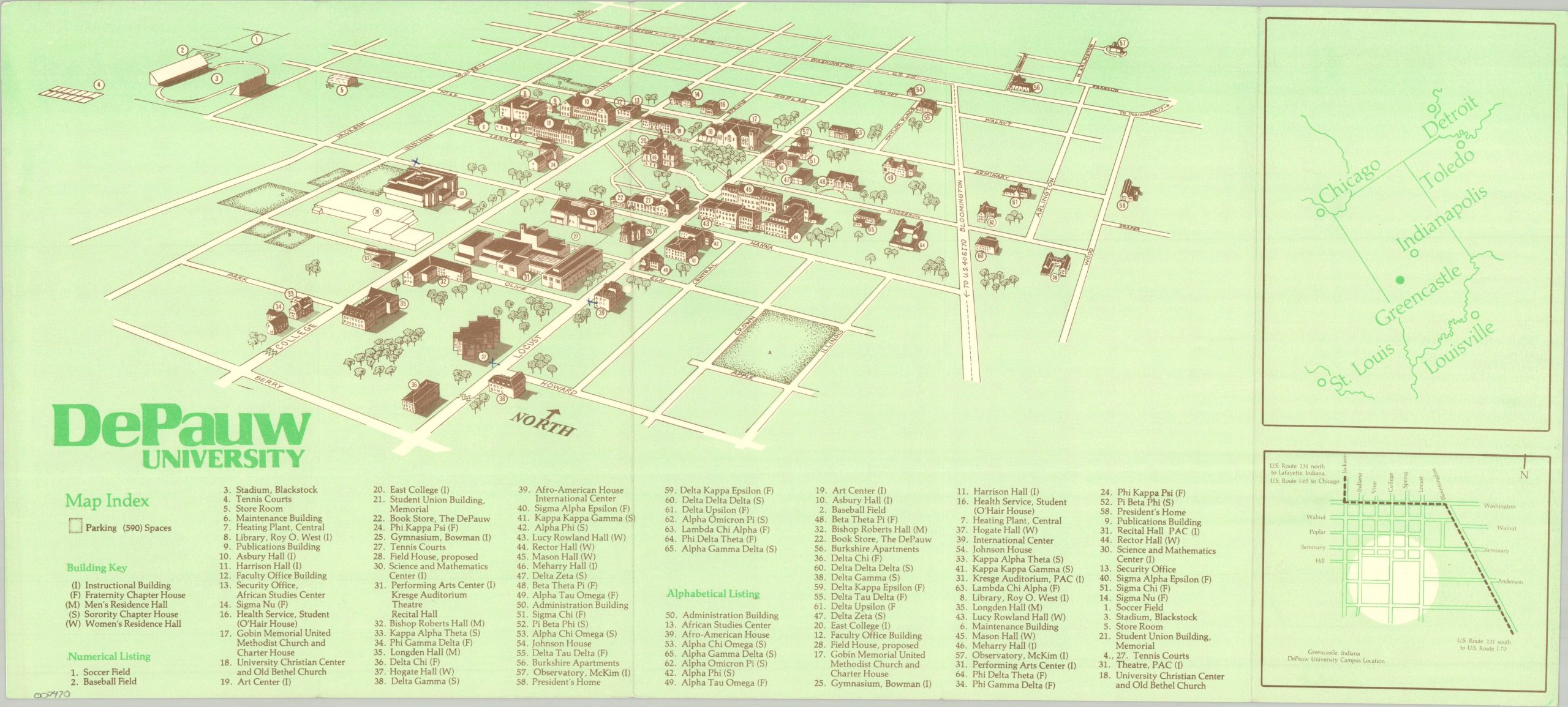 This lovely guide shows the campus of DePauw University in Greencastle, Indiana. Dozens of research buildings, residence halls, sports facilities, and other features are depicted pictorially and identified in the accompanying key (helpfully, both numerical and alphabetical). Plus, nearly 600 parking spaces! Adjacent insets show the primary roads to campus and Greencastle’s location compared to other cities across the Midwest.
