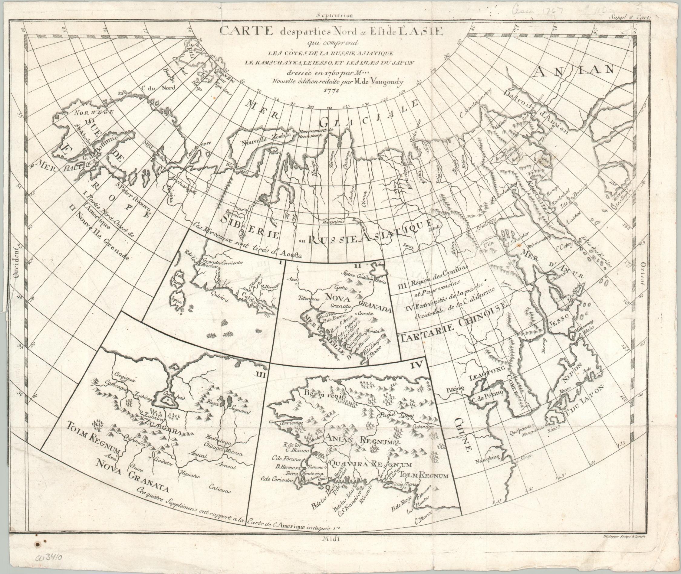 Covering a huge territory between Scandinavia (upper left) to the largely theoretical coast of Alaska (upper right), this map presents a wealth of information about contemporary and historical cartography. It was compiled by Robert de Vaugondy in 1772 for inclusion in Diderot’s monumental Encyclopedie, a foundational publication of the Enlightenment era.