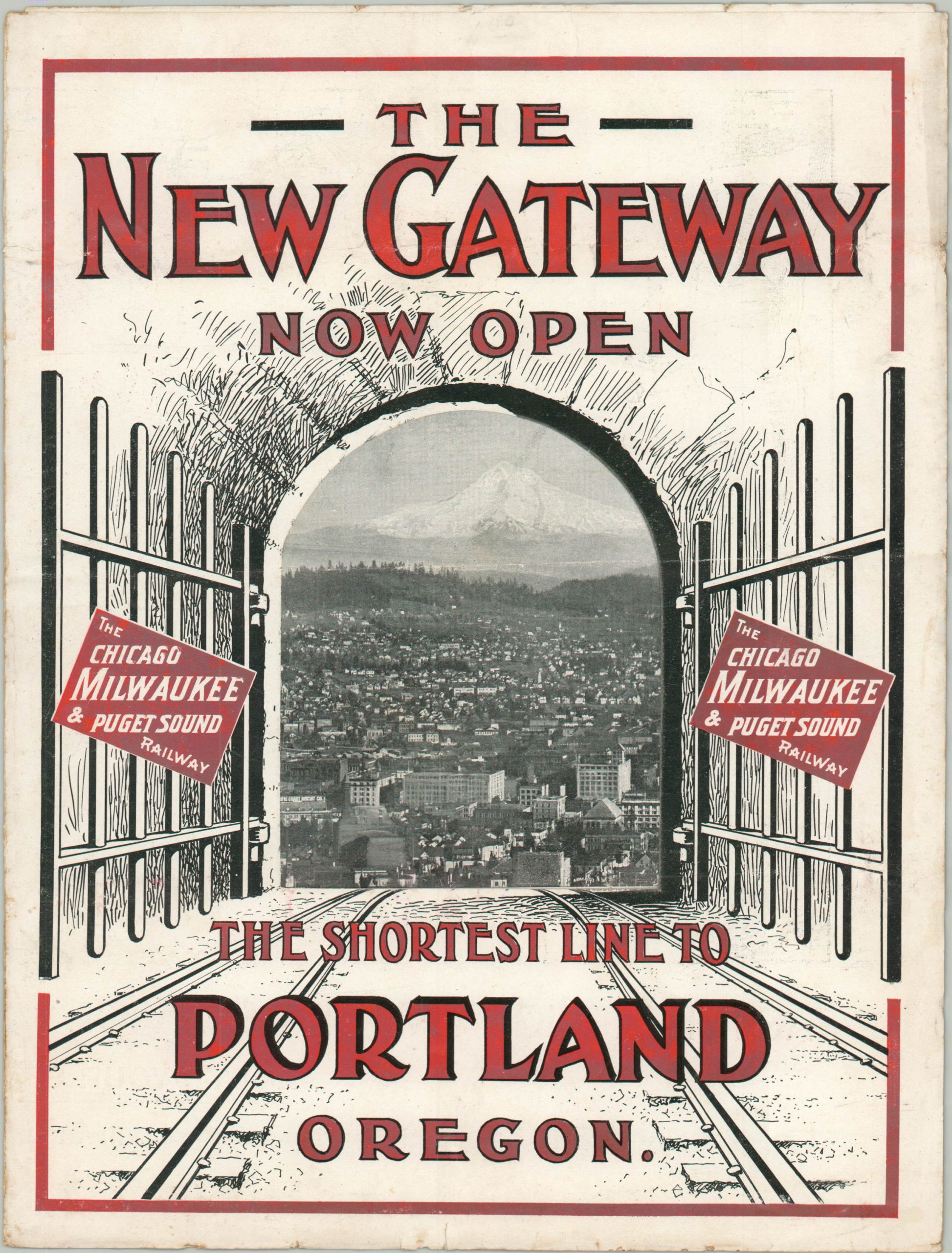 That fact is heavily emphasized throughout this clever bit of advertising, issued by the Poole Brothers of Chicago to promote the newly constructed railroad called the Chicago, Milwaukee & Puget Sound Railway (a subsidiary of the Milwaukee Road). Dozens of stops are crammed along the route, though the accessible area was sparsely populated and most of the freight was commercial, rather than passenger. A large hand points directly to Portland, with a bird’s eye view of the rapidly growing city on the verso that is incorporated into the front cover.