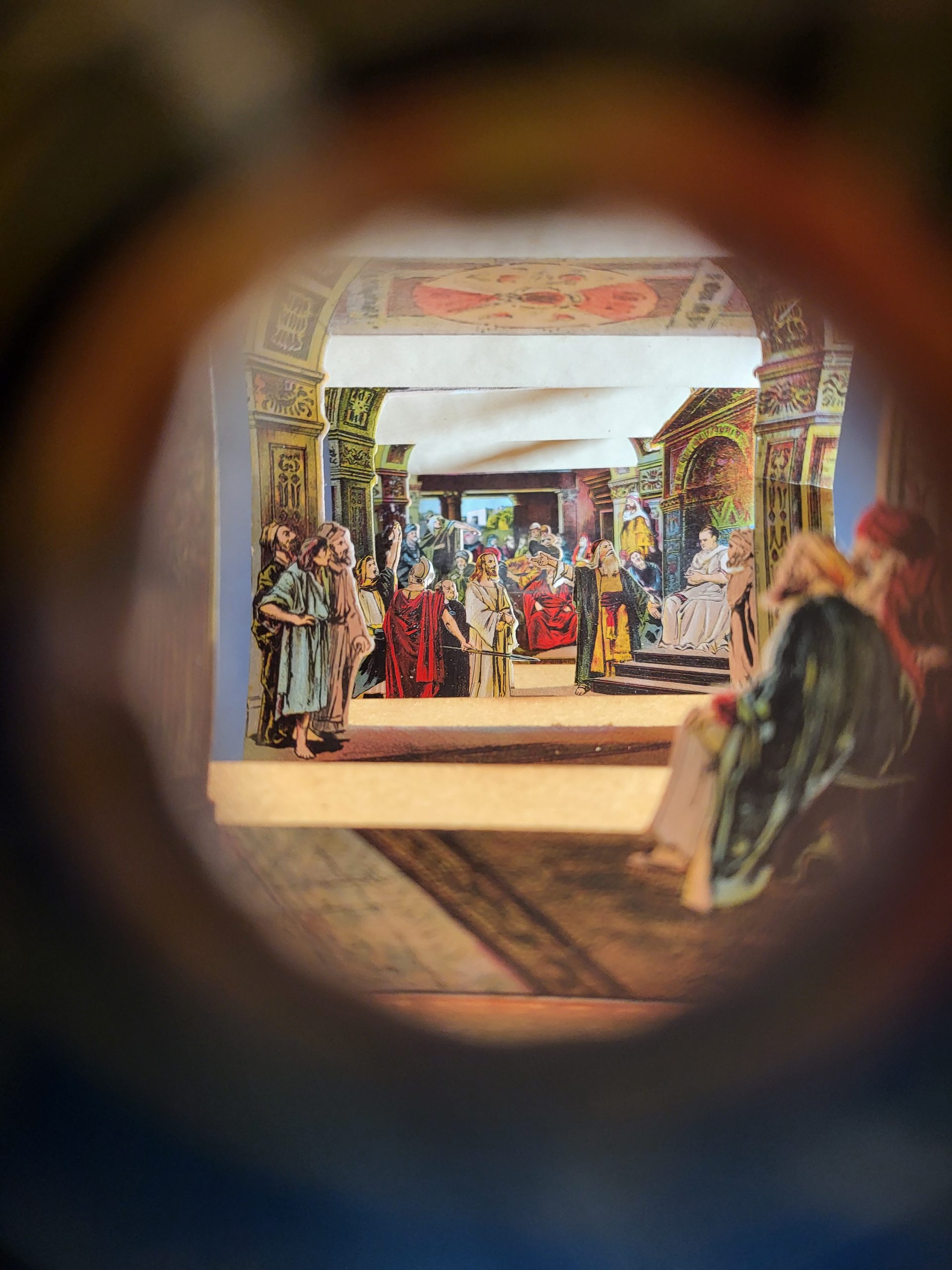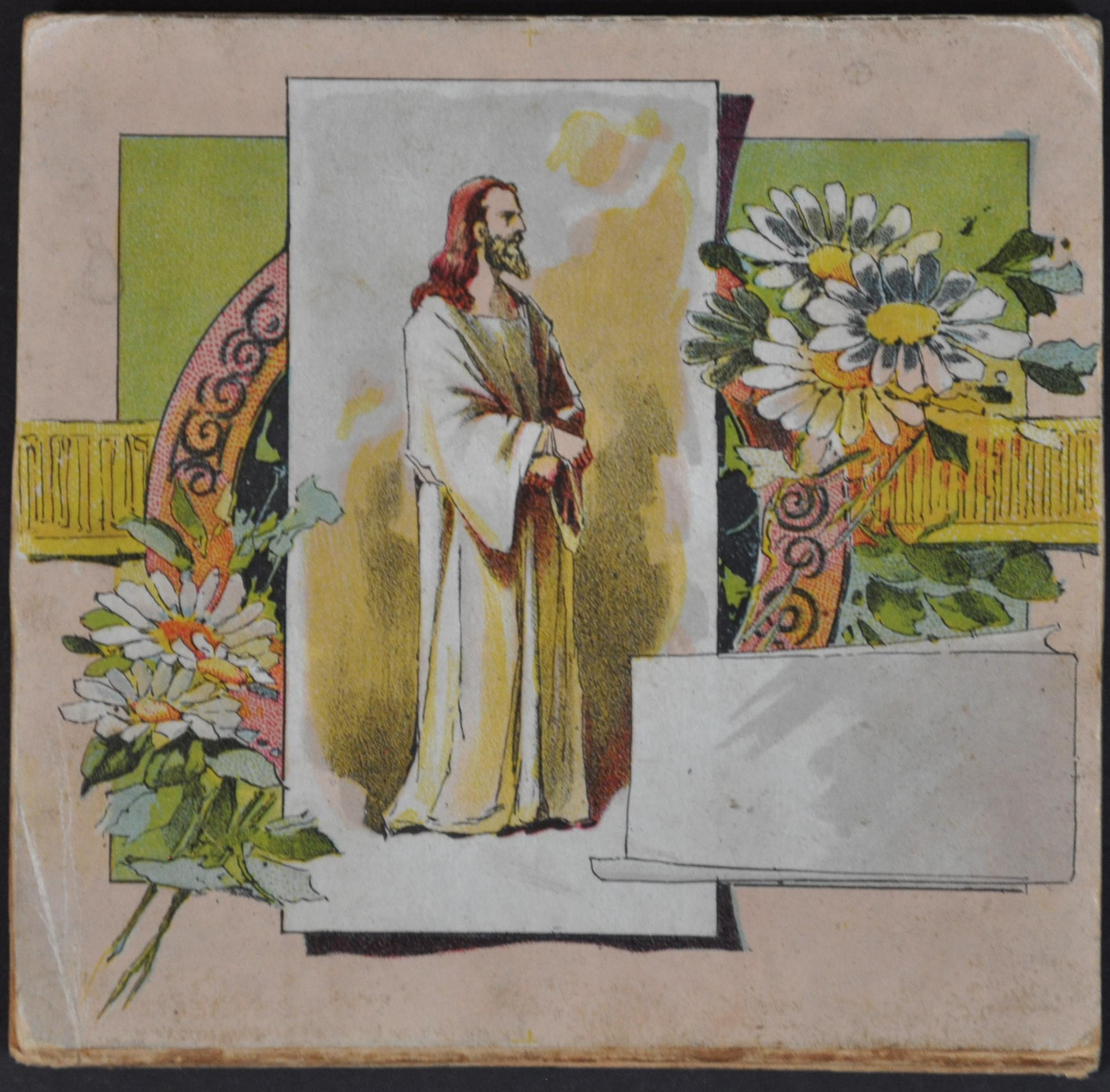 This unusual religious novelty was patented in October 1887 by J.S. Philstrom of Chicago. Two decorative covers unfold, accordion-style, to present a three-dimensional scene of Jesus Christ standing trial before Pontius Pilate. The lavish ‘room’, flanked by elaborate columns, is filled with gesticulating religious leaders, soldiers, scribes, and even a mother and child. Jesus stands resolutely before Pilate, who is sitting atop a throne and apparently deep in thought.