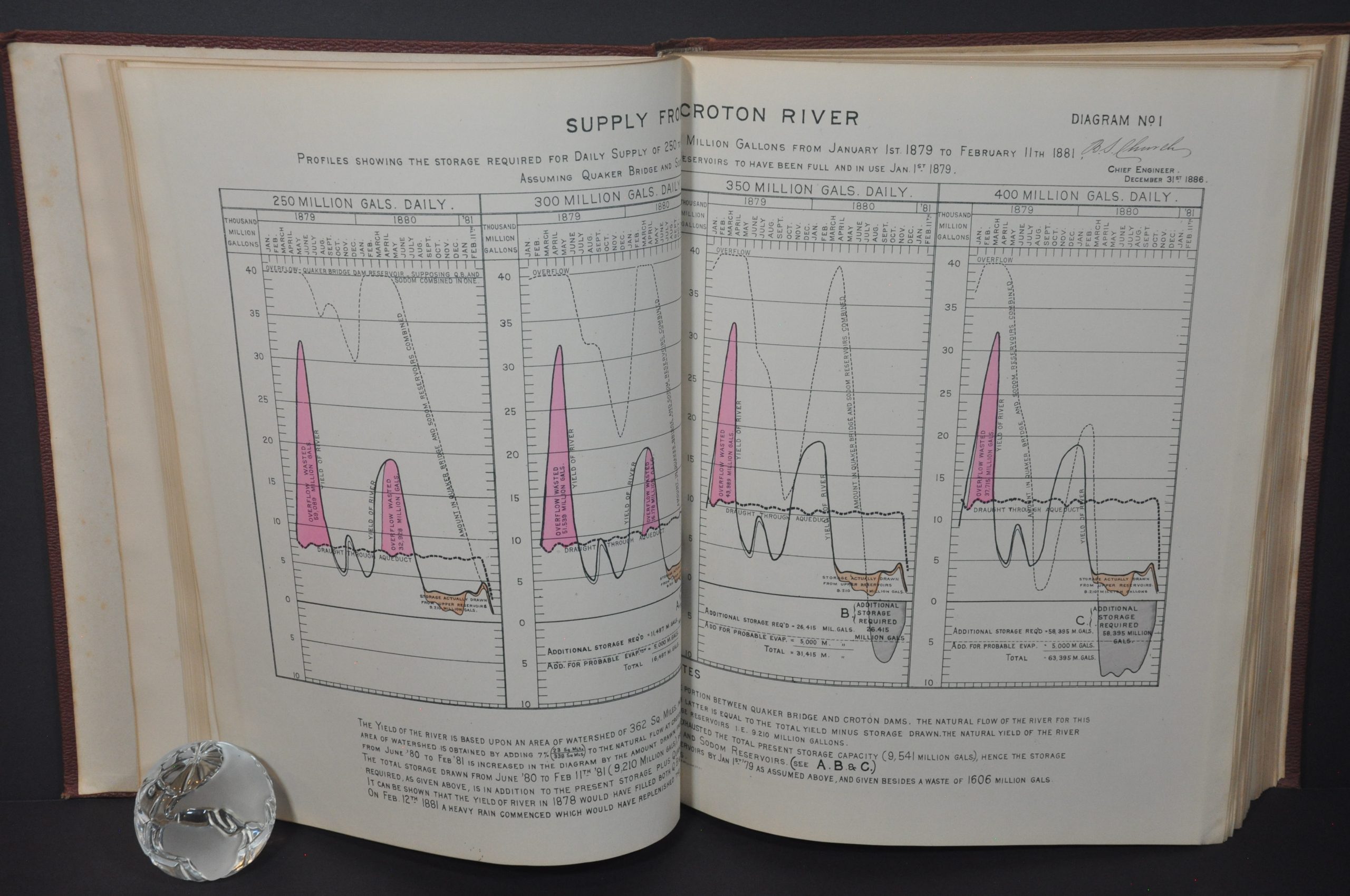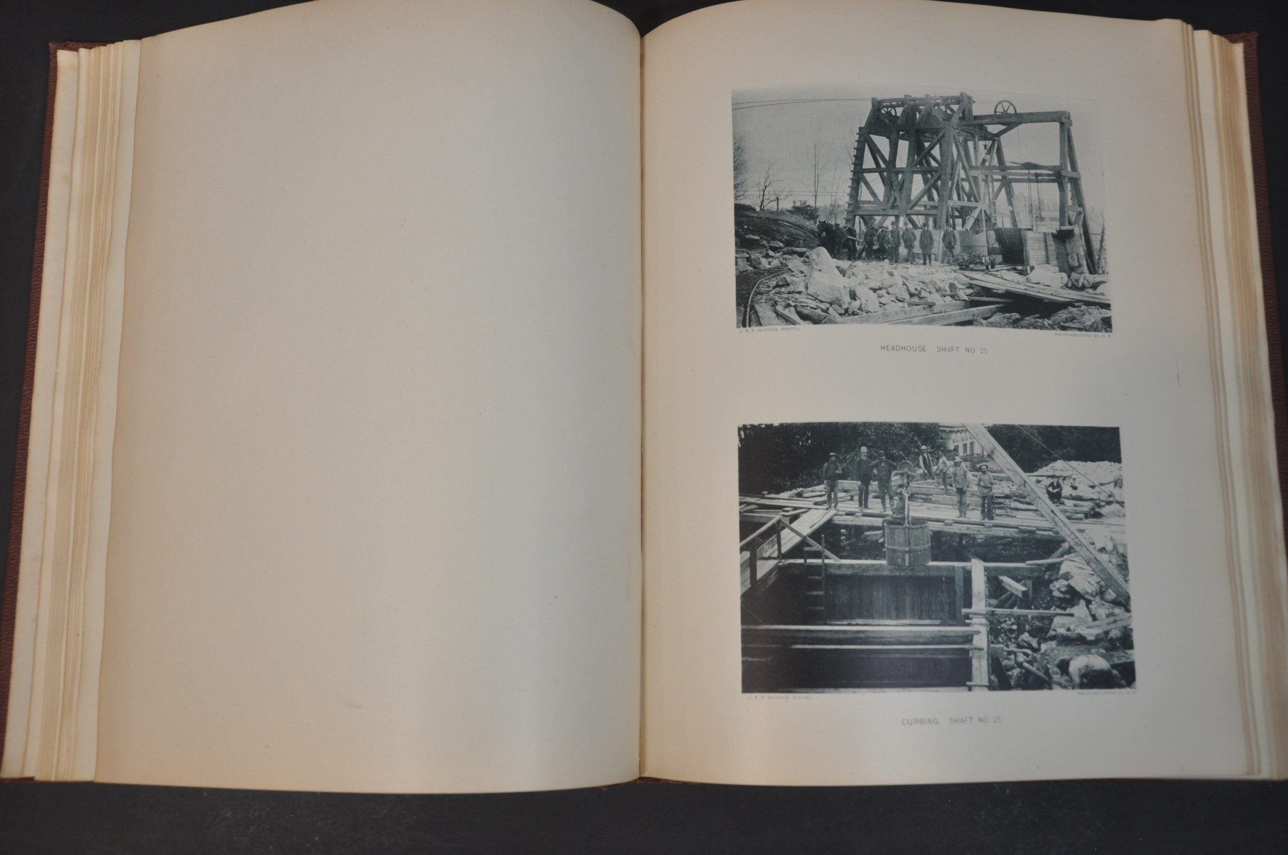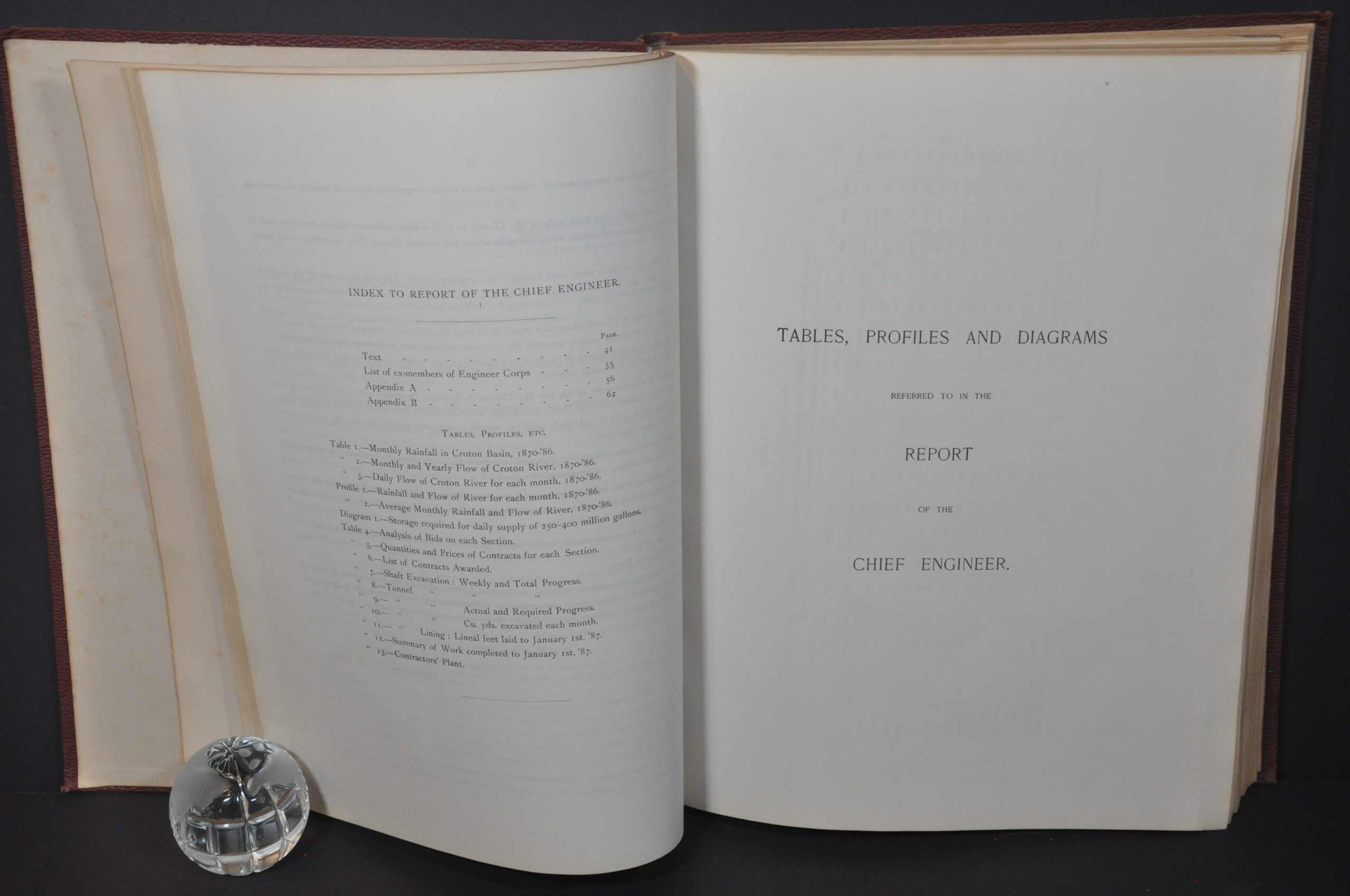 Condition Description: Attractive report bound in original pebbled leather with gilt front cover and spine. Title page and endpapers are lightly spotted, but otherwise in near fine condition. Old dedication inscription on front flypaper. Includes 63 double sided pages of text, 16 tables & diagrams, 24 pages of photographs, 32 pages of progress charts, a large folding map (37.5" x 13.5") of the Croton watershed, plus 56 additional single, double, and folding page maps, drawings, and cutaway views.