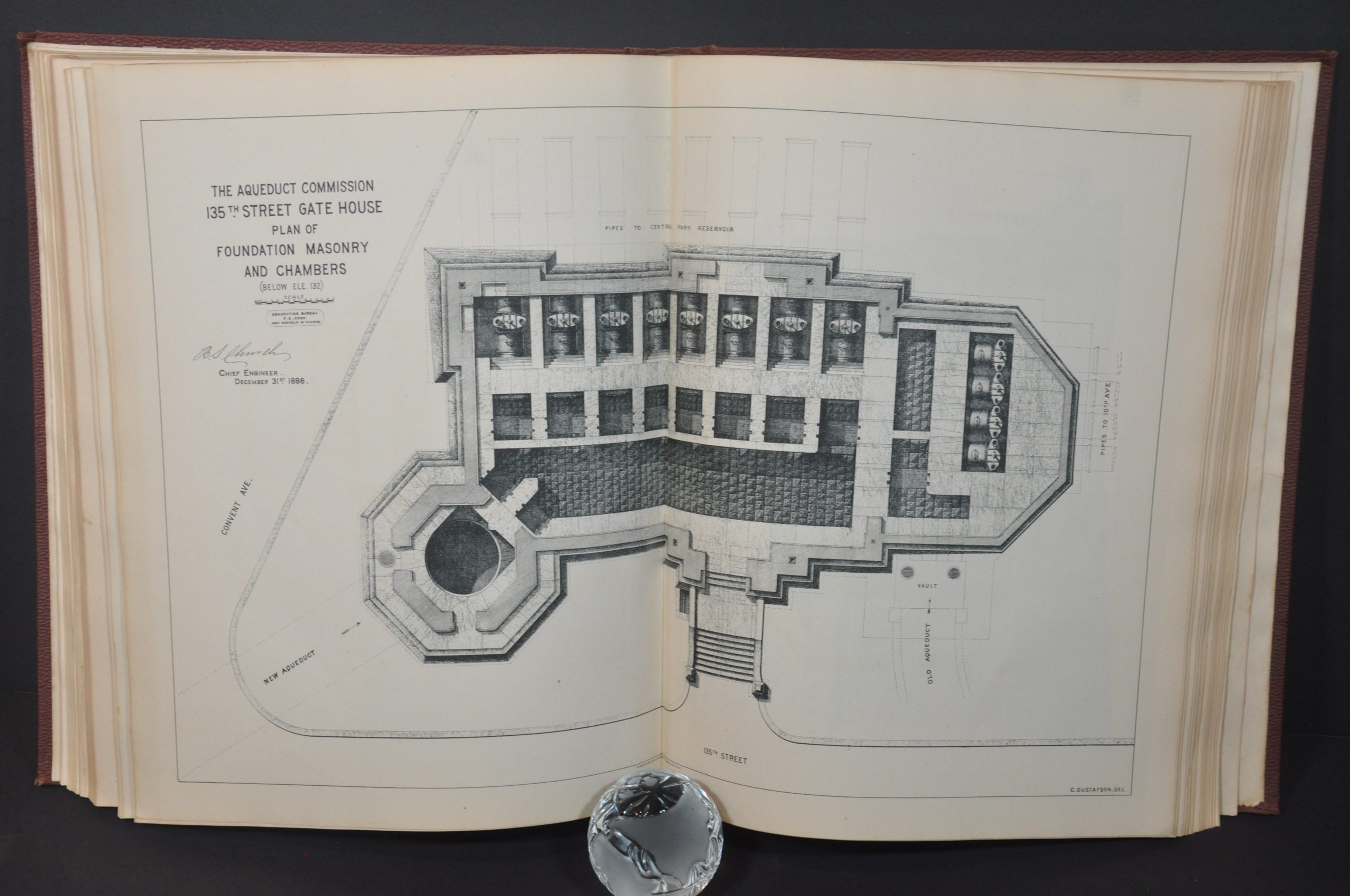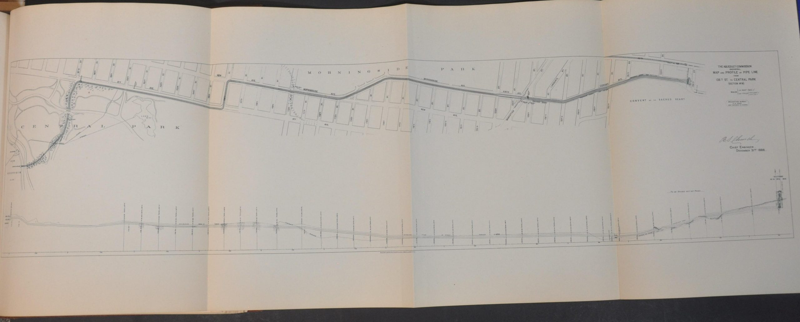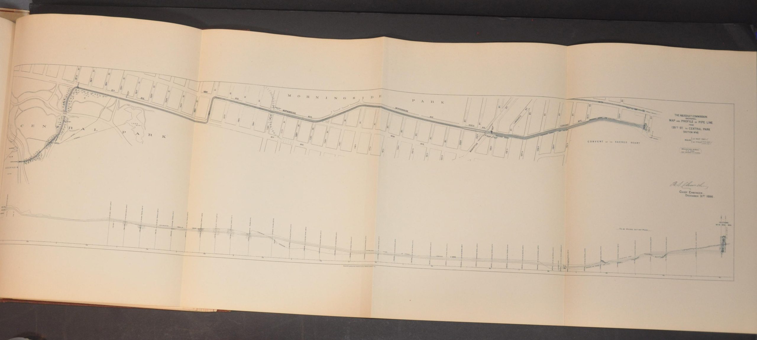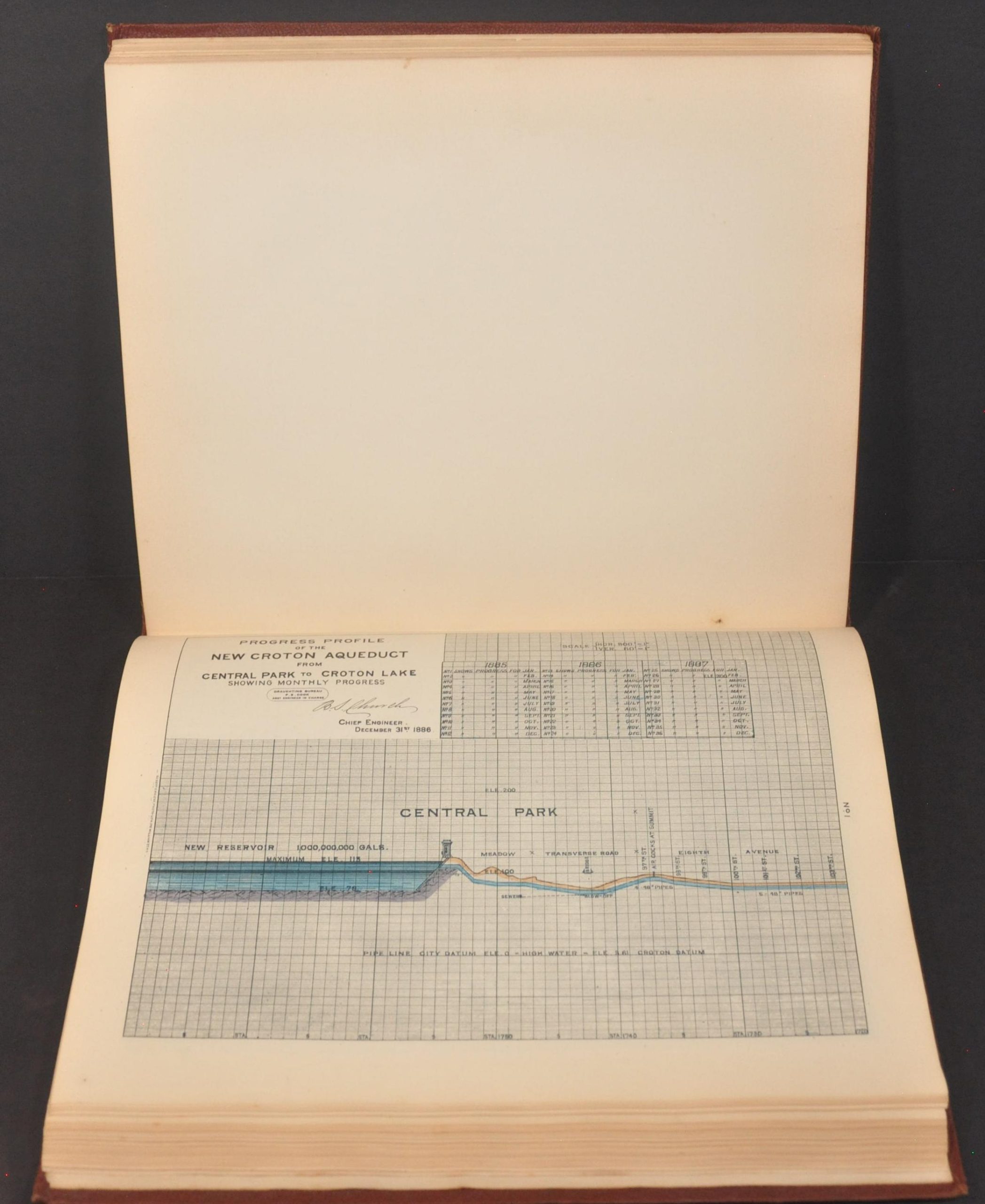 This beautiful volume presents the 1887 report to the Aqueduct Commissioners of New York City by President James. C. Spencer. It contains the reports of the commission secretary, John. Sheehan, and of the chief engineer, Benjamin Church, in addition to a detailed visual overview consisting of dozens of plates, charts, photographs, and maps.