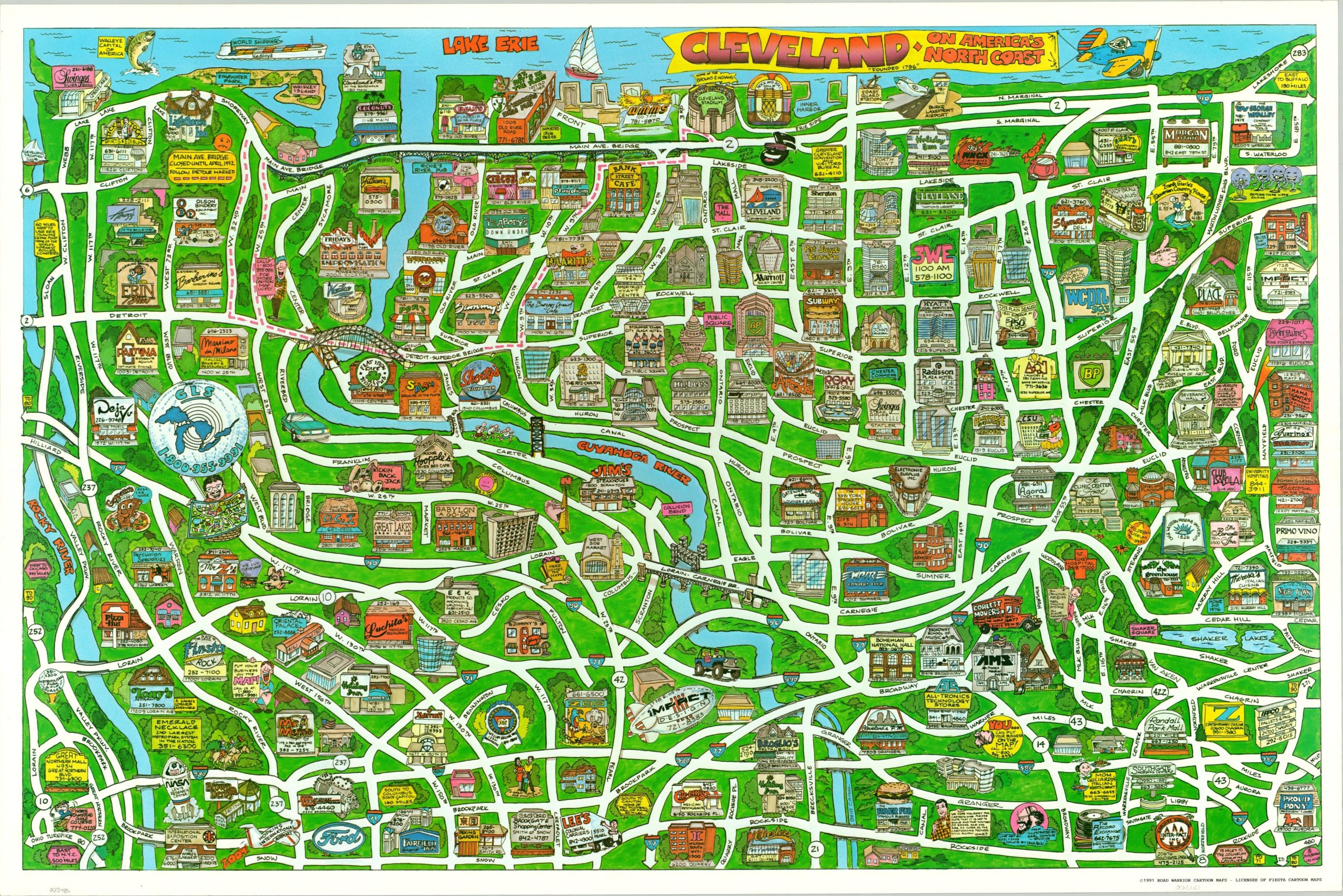 Although there are a few nods to the standalone merits of the city, the image is primarily a composition of small business advertising. Including for the mapmaker! Published in 1991 by Road Warrior Cartoon Maps, a licensee of Fiesta Cartoon Maps.