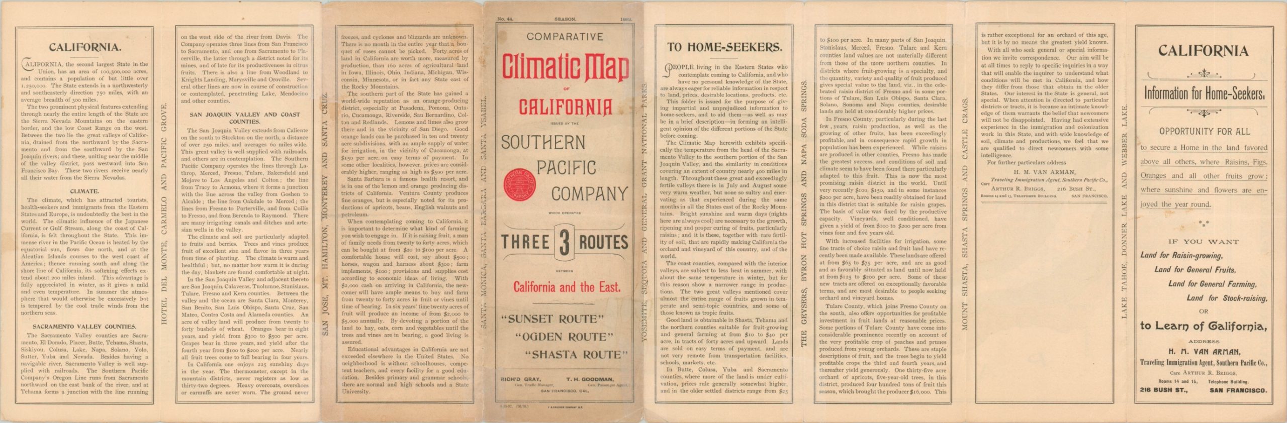 “The climate, which has attracted tourists, health-seekers, and immigrants from the Eastern States and Europe, is undoubtedly the best in the world…California information for home-seekers, opportunity for all to secure a home in the land favored above all others, where raisins, figs, oranges and all other fruits grow; where sunshine and flowers are enjoyed the year round.” [Text on verso]