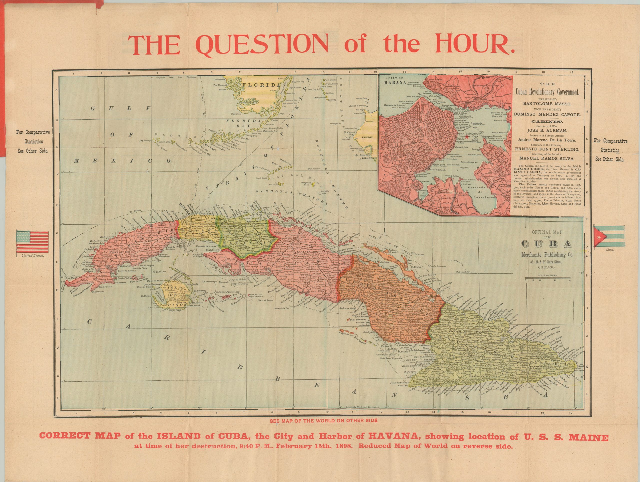 This rare and inflammatory pocket map of Cuba was published by the Merchants Publishing Company in 1898 and distributed by W.G. Young, a druggist operating in Vandergrift, Pennsylvania. Just weeks prior to the map’s issue, the U.S.S. Maine mysteriously blew up in Havana’s harbor while stationed there to protect American property in the midst of Cuba’s ongoing war of independence. The explosion was attributed to Spanish saboteurs and encouraged the U.S. public to support intervention on Cuba’s behalf – the “Question of the Hour” posed at the top of the sheet.