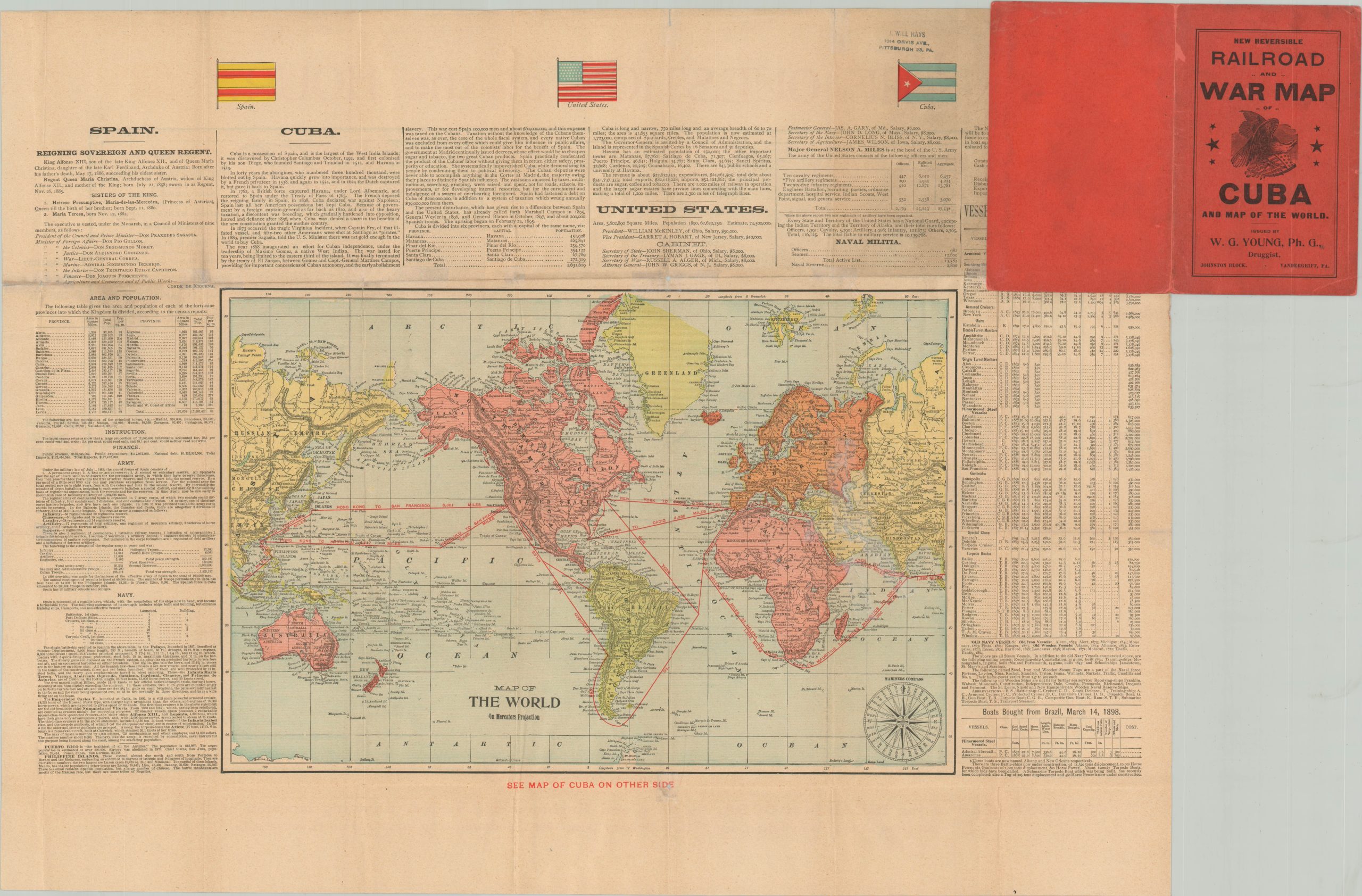 A world map on Mercator’s Projection can be found on the verso. This is surrounded by blocks of text describing the military strength of the various belligerents (Spain, Cuba, and the U.S.), including a comprehensive list of ships of the United States Navy as of March 14, 1898.