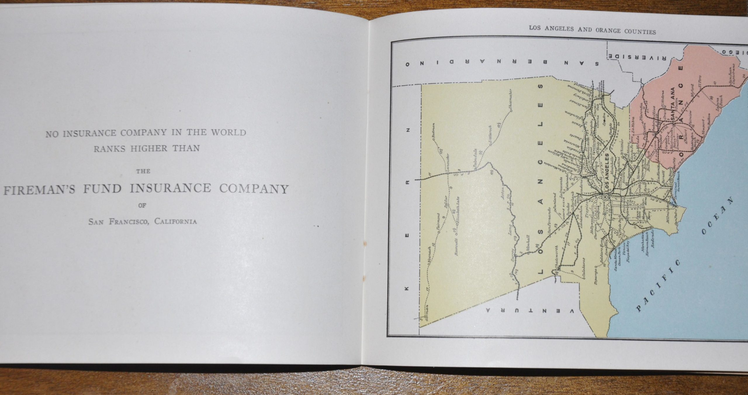 Opposite each map is a pragmatic advertisement from the Fireman’s Fund Insurance Company, called such because 10% of profits were paid to the widows and orphans of fallen firefighters. However, perhaps the most effective message are the two prints in the first few pages, which show a glimpse of the destruction wrought by the 1906 San Francisco Earthquake. Fires started as a result of the quake and quickly consumed nearly three quarters of the city. Most insurance companies didn’t indemnify earthquake damage, leading some unscrupulous owners of buildings still standing to set them alight. Ultimately, around $250 million dollars would be paid out in claims, leading to the bankruptcy of over 20 companies. The Fireman’s Fund office and documentation was destroyed, but it weathered the quake by taking claimants “on their word” and paying policyholders in a combination of cash and stock. The company would go on to insure much of the Hollywood silent film industry, the Golden Gate Bridge, and the Spirit of St. Louis.