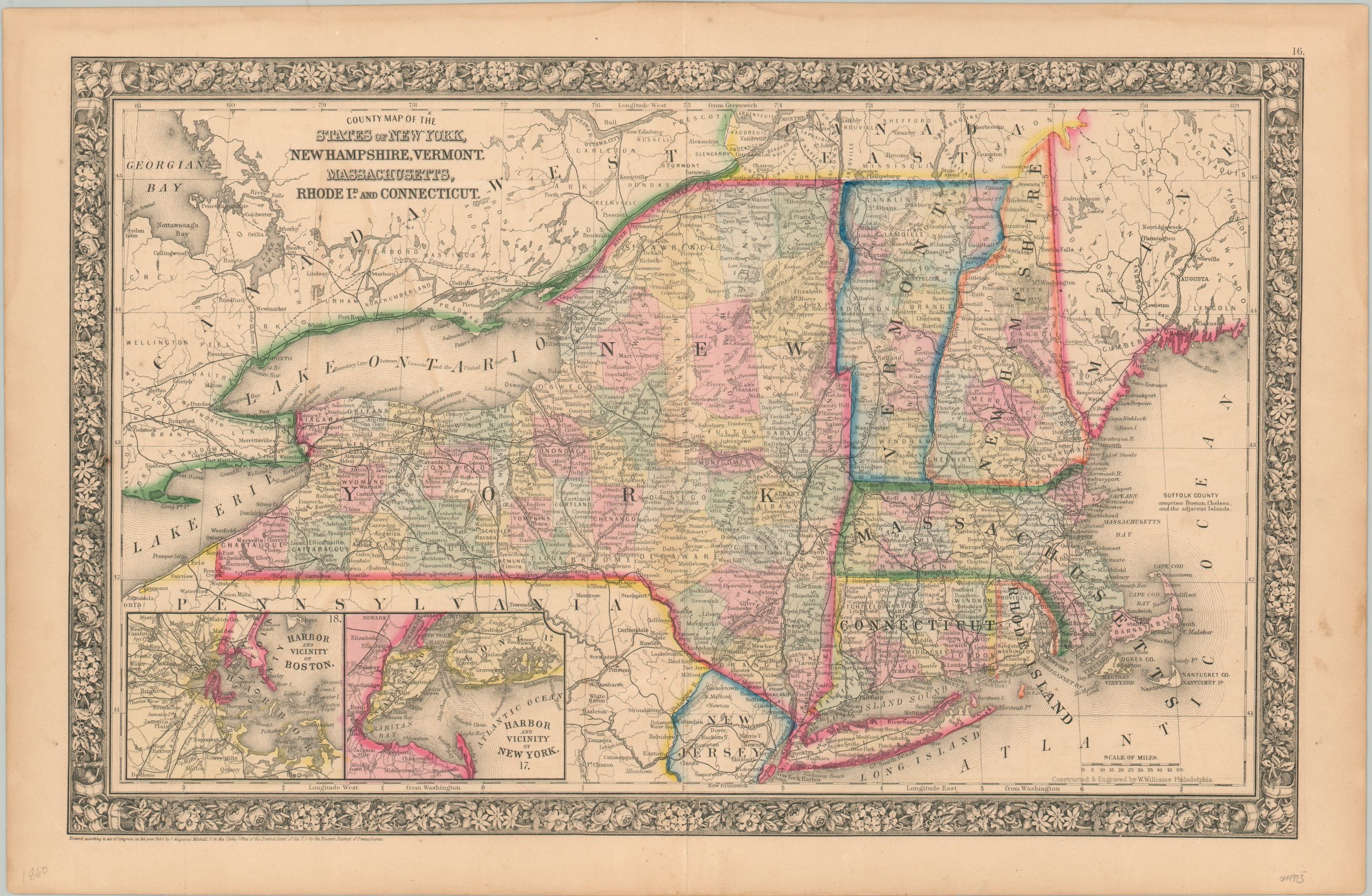 This interesting map of New England was published in Philadelphia by Samuel Augustus Mitchell in 1860. Mitchell was one of the most prominent American mapmakers of the 19th century, and initially got involved with cartography as a school teacher who was frustrated with the quality of available maps. He collaborated with skilled engravers and produced high-quality maps and atlases that contained the most up-to-date information available. Mitchell’s son (of the same name) would take over the business after his death in 1860 and continue the tremendous output.