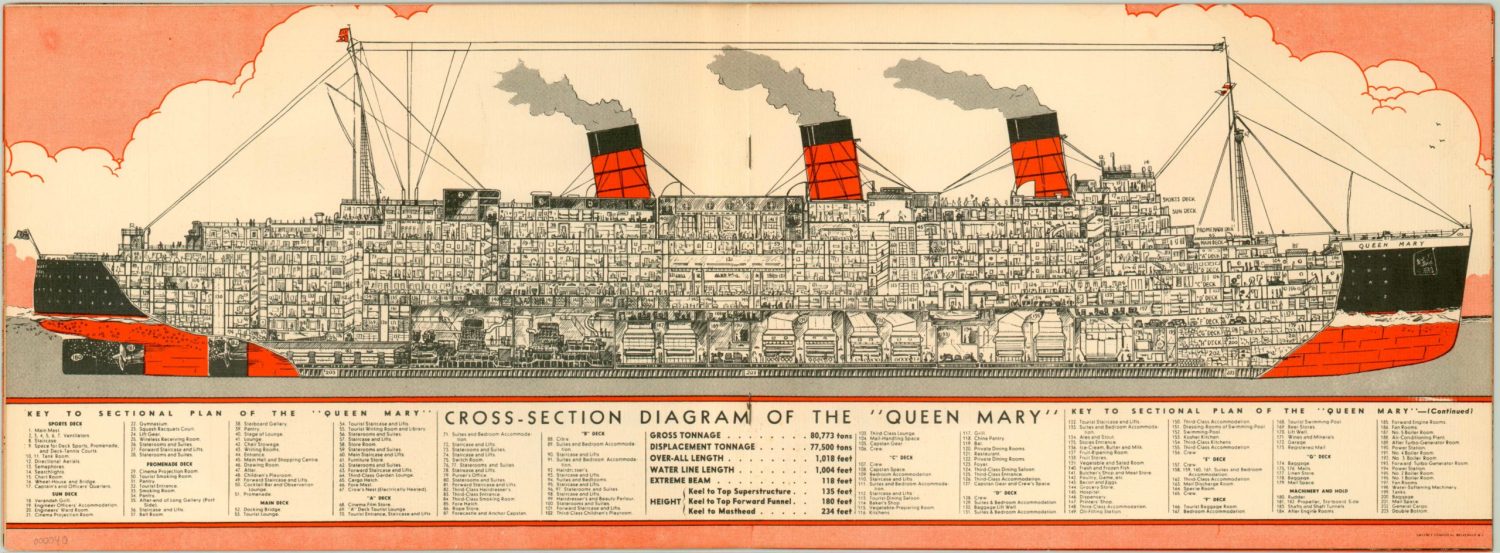 Over two hundred individual locations, organized by deck, are listed in this cross-section of the transatlantic flagship of the Cunard and White Star Line. The diagram was published in a book of comparisons designed to promote the ship at a time of financial difficulty for the recently merged lines and includes such boasts as “the voice of the Queen Mary can be heard ten miles away!”