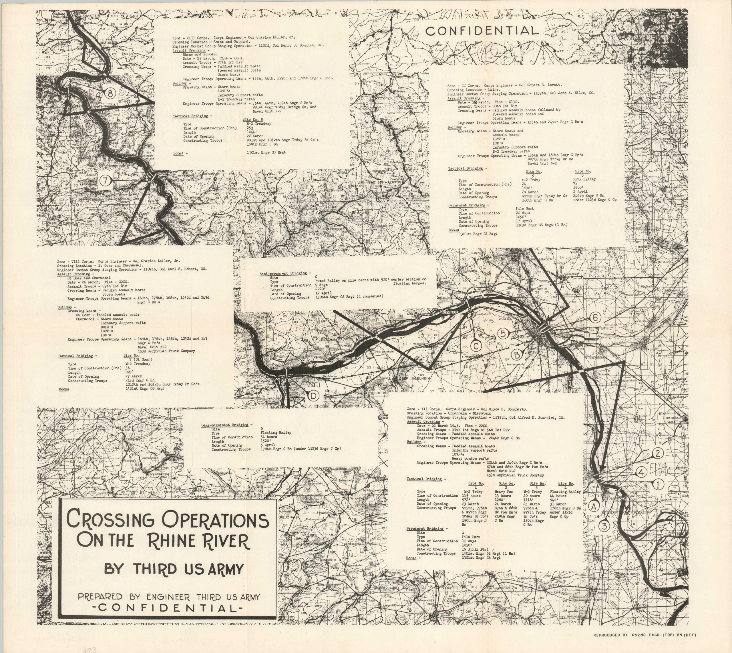 This fascinating booklet and map, both marked CONFIDENTIAL, documents in detail the efforts of the Third U.S. Army to cross the Rhine River during its advance through Germany. The responsibility fell largely to the Corps of Engineers, who designed several bridges and ferry systems to transport troops, vehicles, and supplies across the imposing waterway.