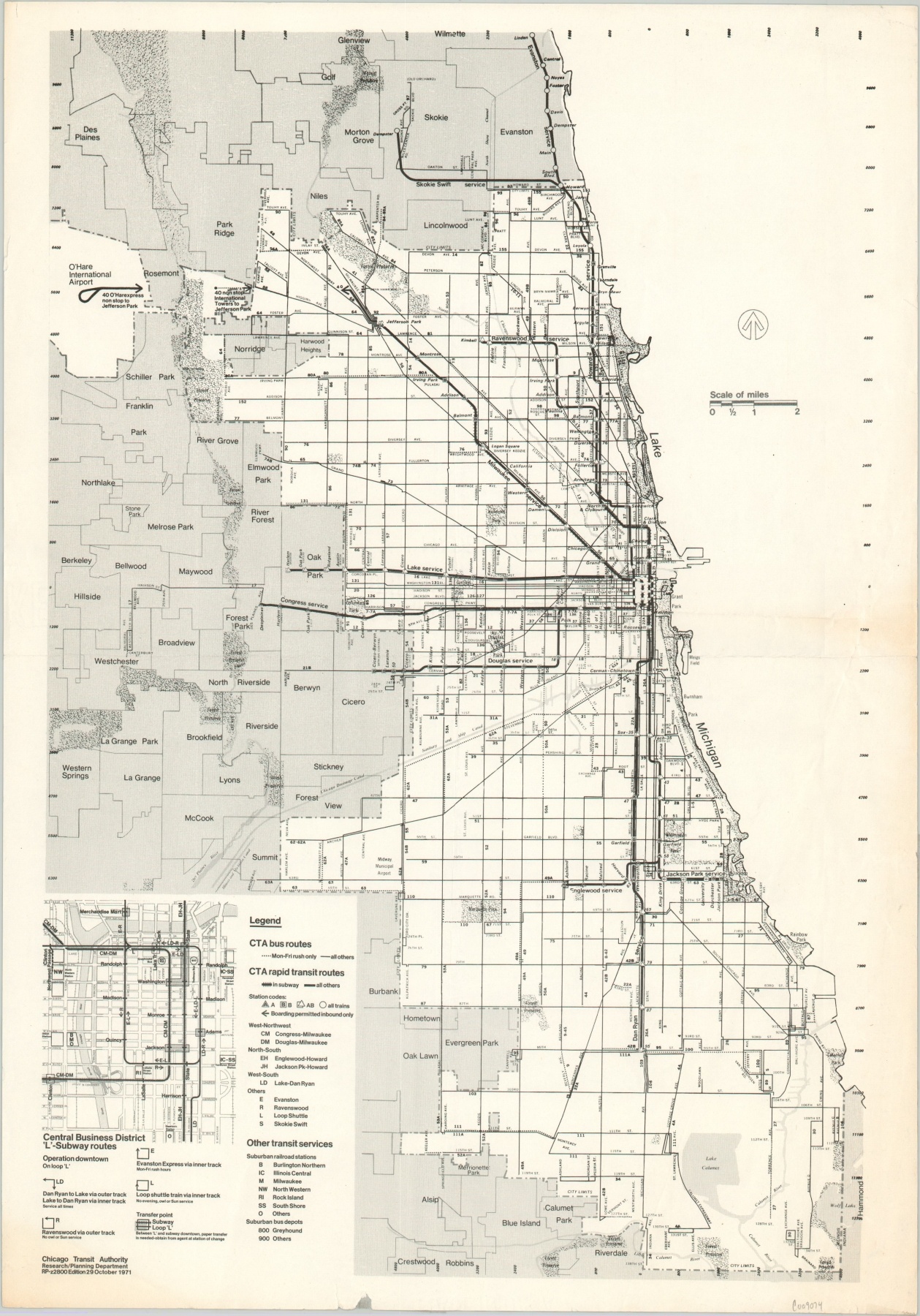 Published by the Chicago Transit Authority (CTA) in 1971, this map of Chicago shows the city’s transportation network near its maximum extent under the agency’s authority. Just two years after the map was issued, the Regional Transportation Authority was created to regulate and manage suburban operations.