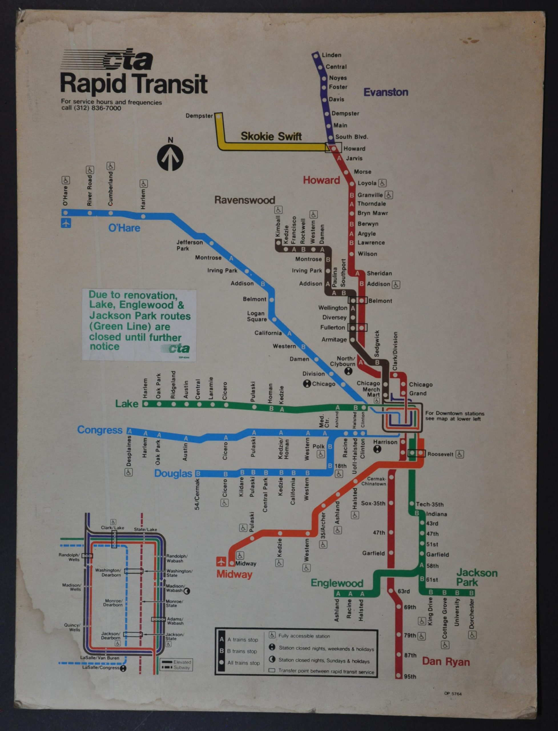 This well-used sign shows the operational routes of the Chicago Transit Authority (CTA) elevated lines, known belovedly by residents as the ‘L’. It was likely issued in late 1992, after the closure of several stations (California/Lake, Harvard, Wentworth, and Grand/Milwaukee), but before the CTA officially adopted its iconic color-based name system in 1993.