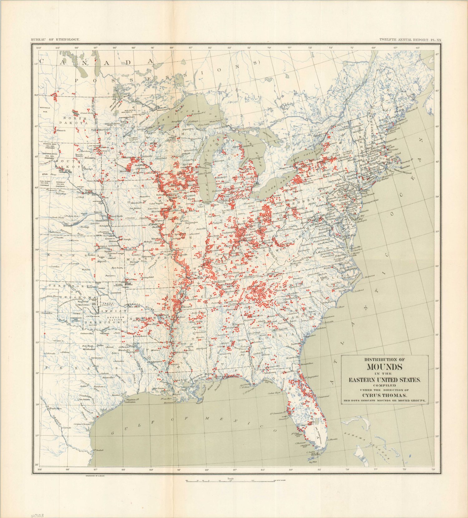 This ‘pocked’ map of the Eastern United States was compiled under the direction of Cyrus Thomas and engraved by the United States Geological Survey for publication in the Twelfth Annual report of the U.S. Bureau of Ethnology.
