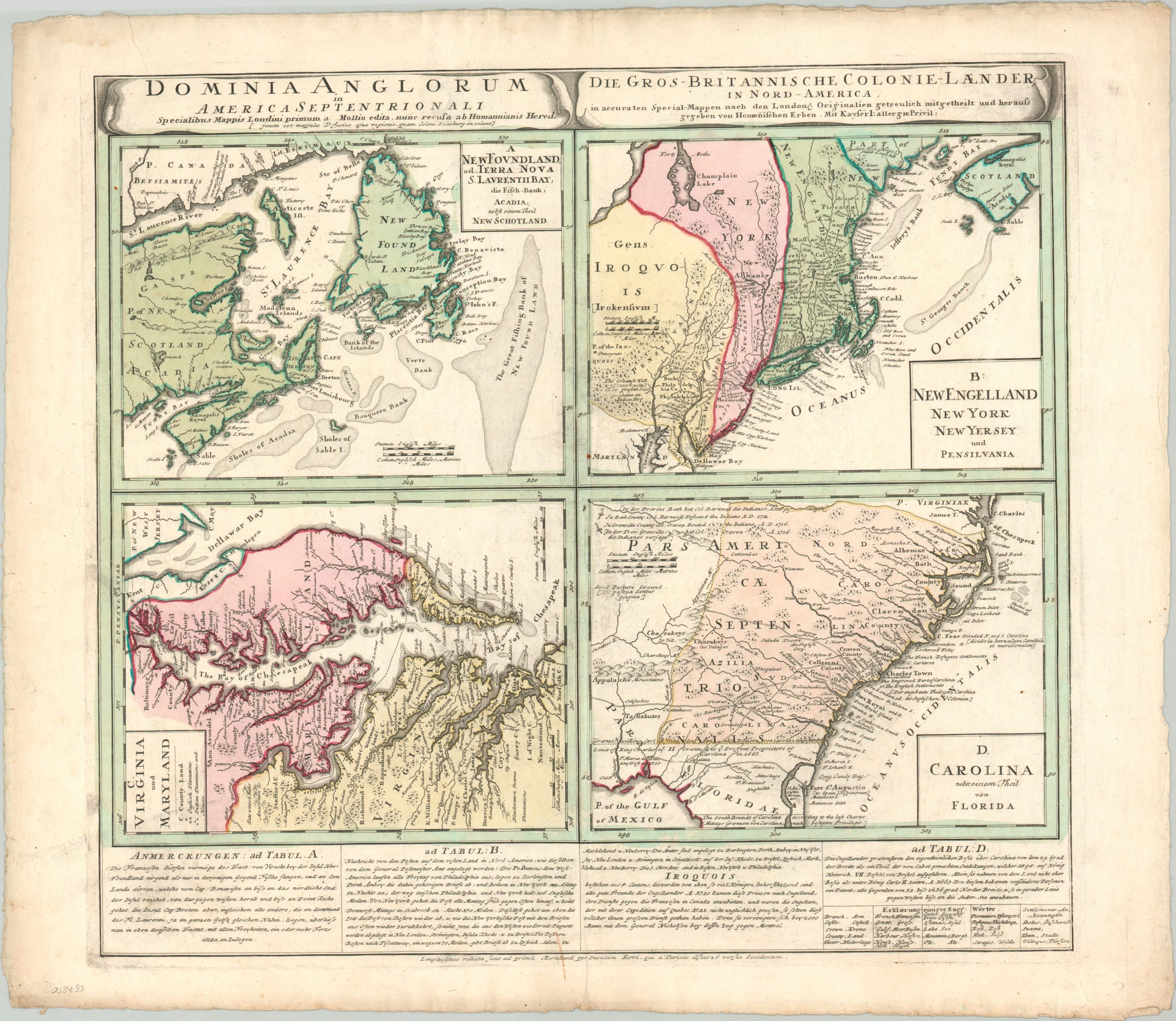 The upper left shows territory in Newfoundland and around the Bay of St. Lawrence, with portions of the ‘lost’ colony of New Scotland. The Grand Banks are prominently noted as well. The map immediately to the right shows claims in New York and New England, with large areas in Pennsylvania noted as belonging to the Iroquois. The lower left presents the colonies of Virginia and Maryland, while the opposite can be seen the Carolinas and portions of Spanish Florida.