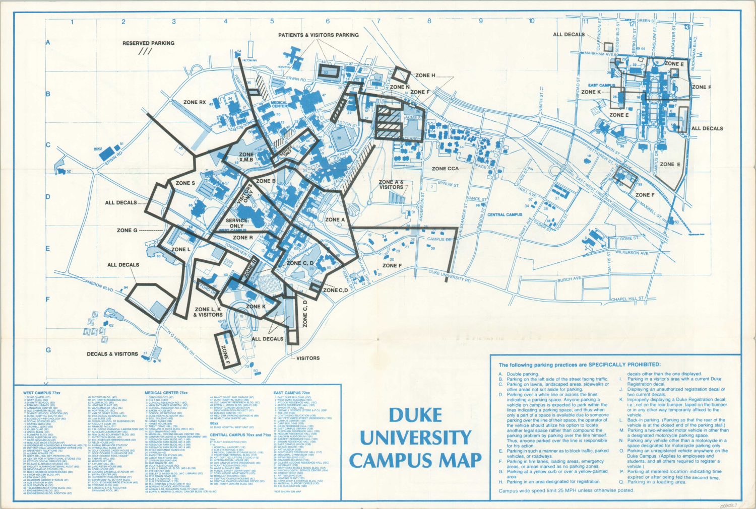 This handy reference guide (appropriately printed in blue) shows the campus grounds of Duke University, located in Durham, North Carolina. Dozens of buildings and facilities are outlined and numbered in the lower left.