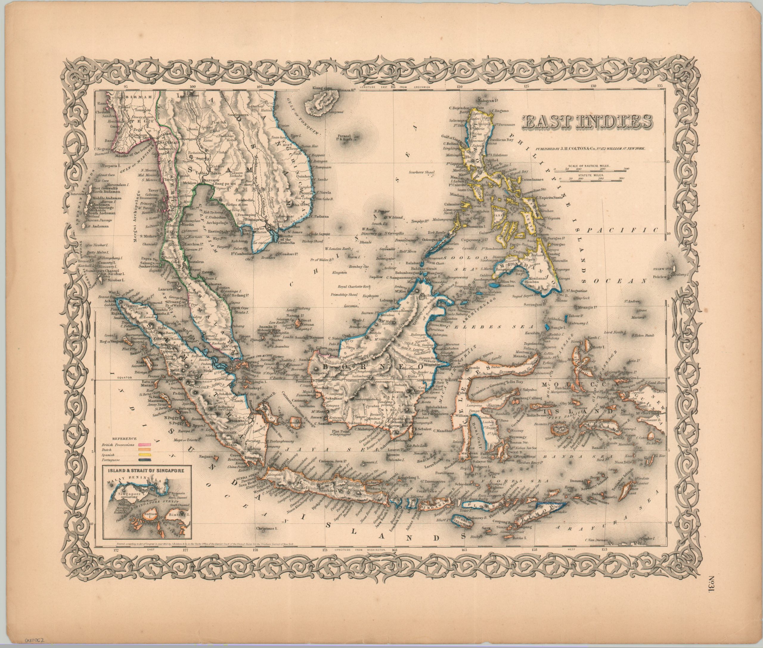 This wonderfully detailed map of the hotly contested region was published in New York in 1855 by J.H. Colton & Co. Pink, orange, yellow, and blue highlights coastal areas claimed by the British, Dutch, Spanish, and Portuguese, respectively. An inset in the lower left presents the Singapore Strait and toponyms identify a fascinating variety of European outposts, native settlements, geographic features, and notable landmarks. The image reflects the era of intense resource extraction and the establishment of complex colonial administrations that profoundly shaped the region’s future.