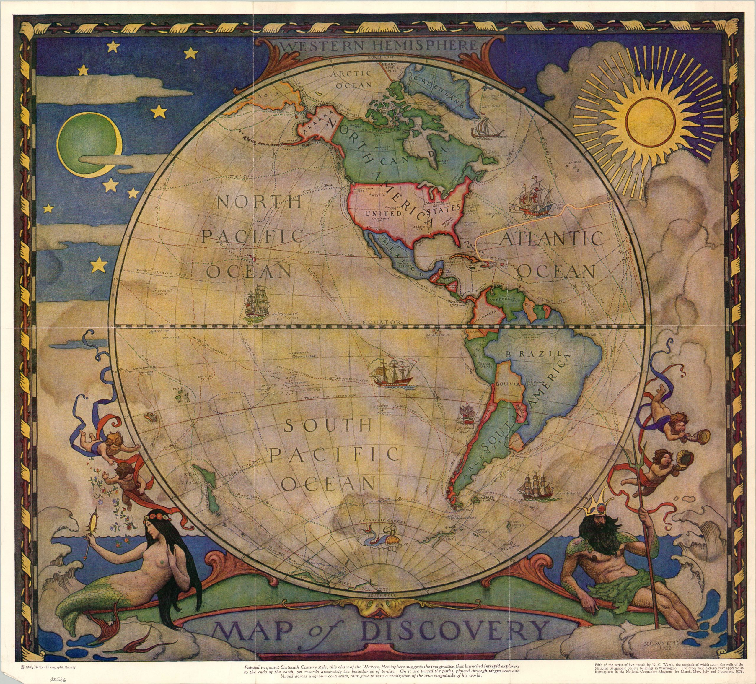 Designed to appear in the same style as sixteenth-century maps, this pair of images are based on a wall mural originally designed for the National Geographic Society building by N.C. Wyeth. Decorative elements such as sailing ships, wind heads, and sea monsters were all common on maps produced during the “Golden Age of Cartography” and appear here alongside routes taken by early explorers.