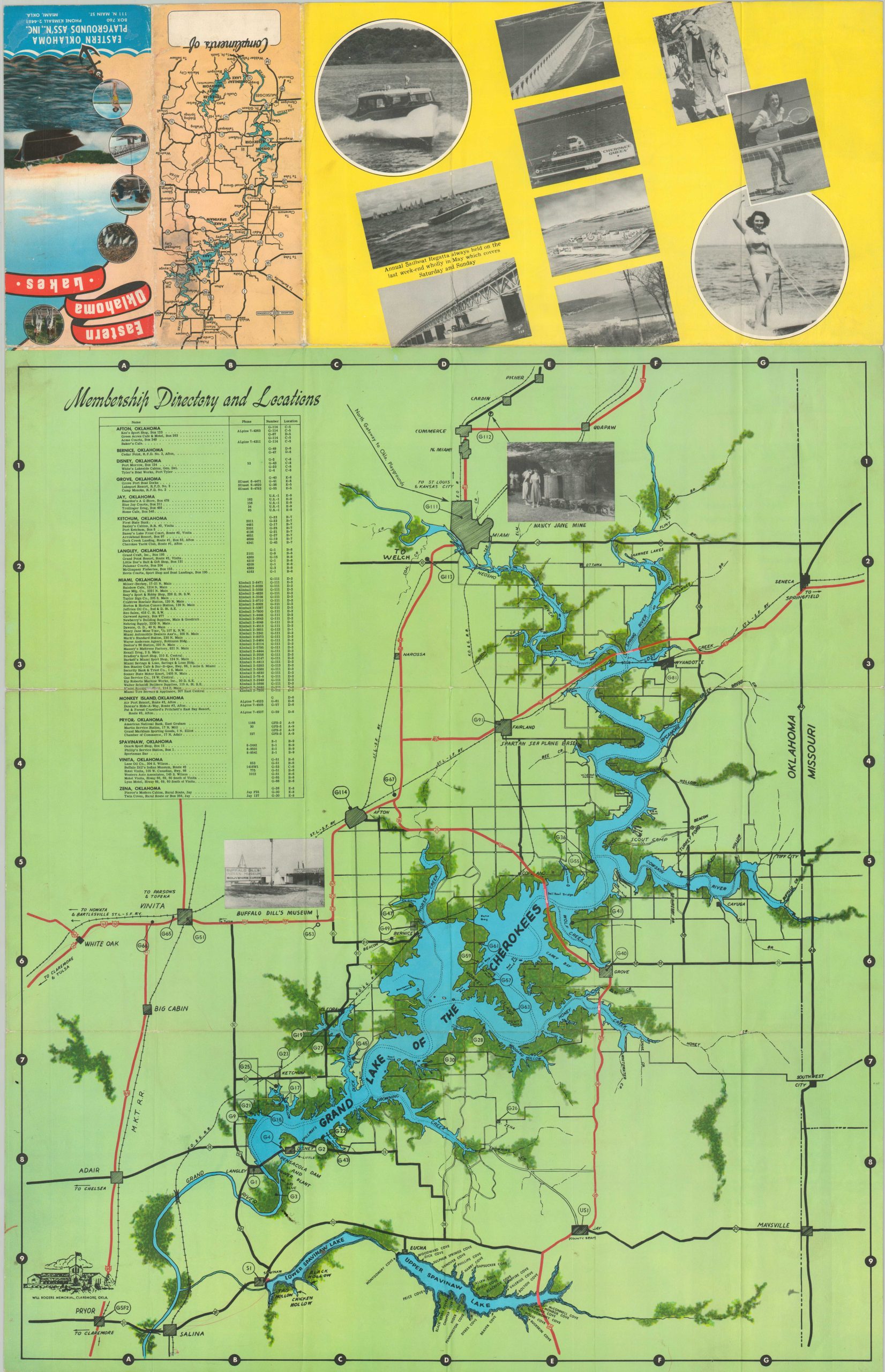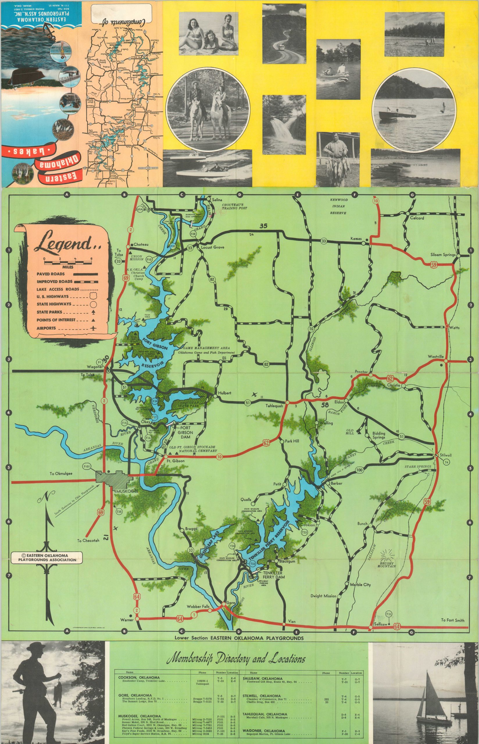 This colorful promotional brochure was designed and published by MWM Color Press, Inc. of Aurora, Missouri and distributed by the Eastern Oklahoma Playgrounds Association, Inc. A simple transportation map illustrates various lakes, forests, rivers, and reservoirs around the towns of Muskogee and Miami.