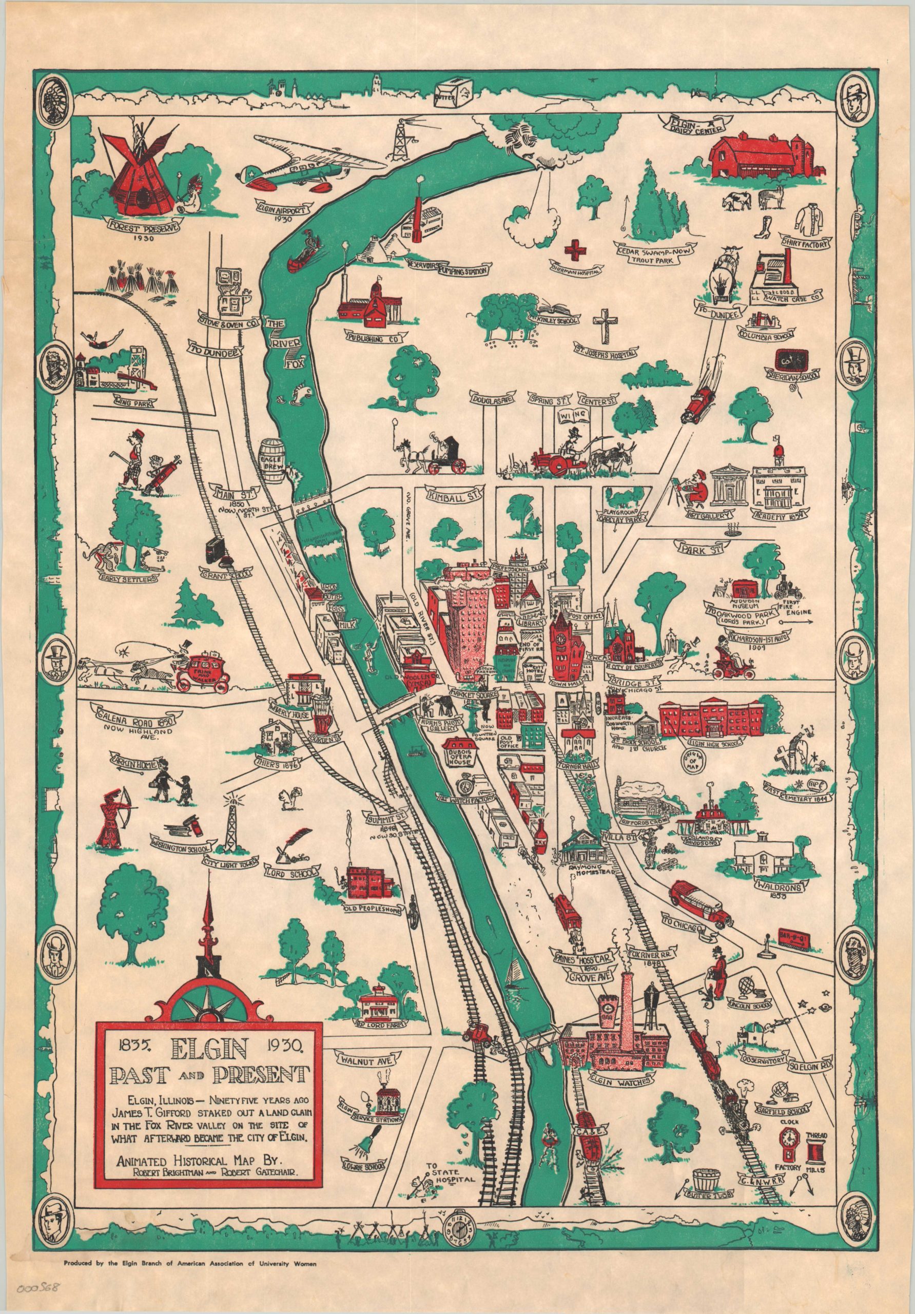 This map of Elgin, Illinois shares many characteristics with other pictorial maps of the 1930’s. A product of civic pride, they often combine historical and modern aspects while highlighting local industry, recreation, and points of interest. Outside financial support, in this example in the form of the American Association of University Women, was often required for production during the Great Depression. Colors could be limited and illustrations frequently had a “folksy” look.