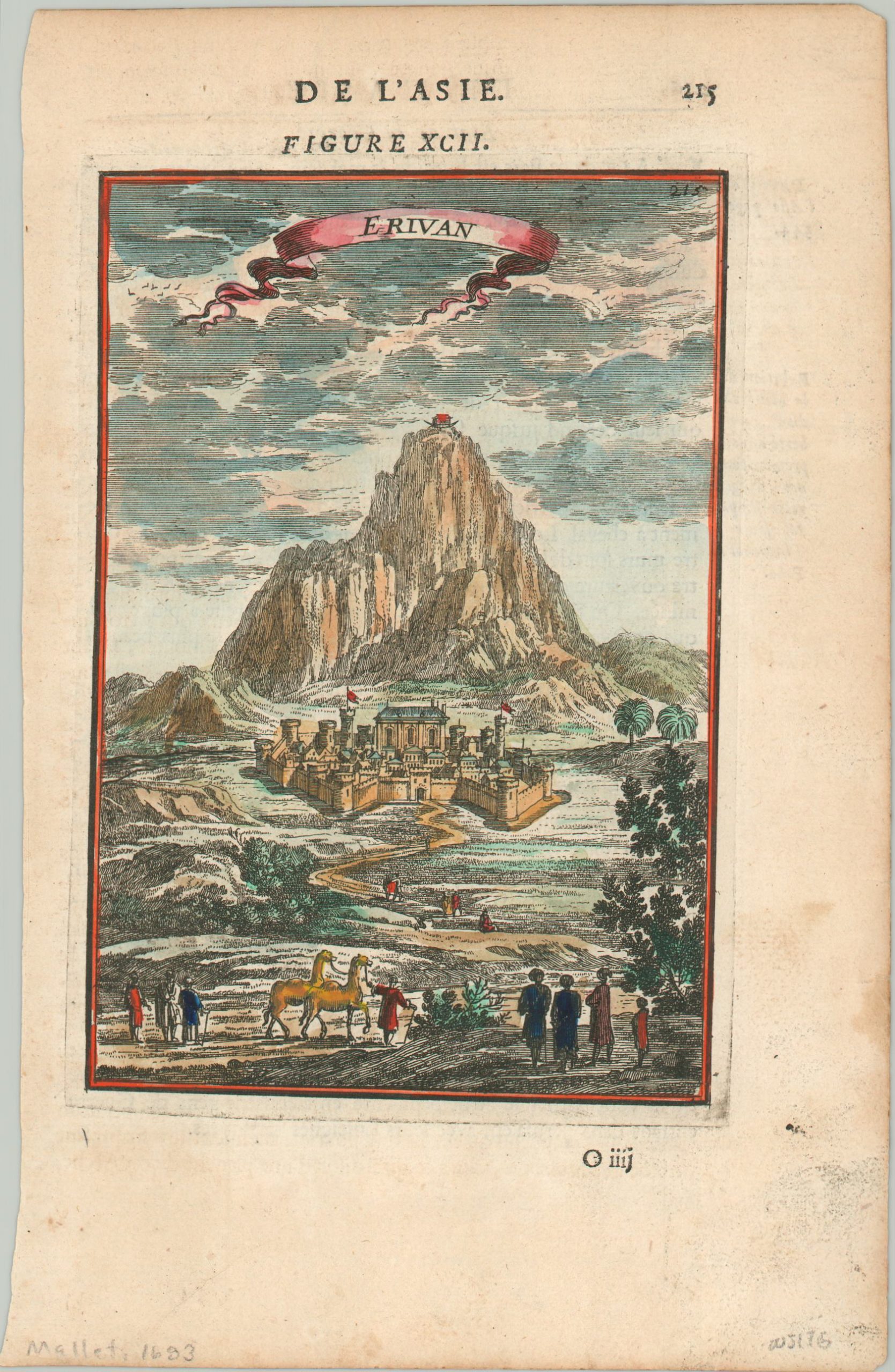 This is a fanciful historic view of Erivan (Yerevan, Armenia), with what is probably Erebuni Fortress situated in front of Mt. Ararat in the background. The latter was the alleged landing spot of Noah’s Ark, which can be seen perched precariously at the peak. Figures in the foreground reflect local Persian authority.