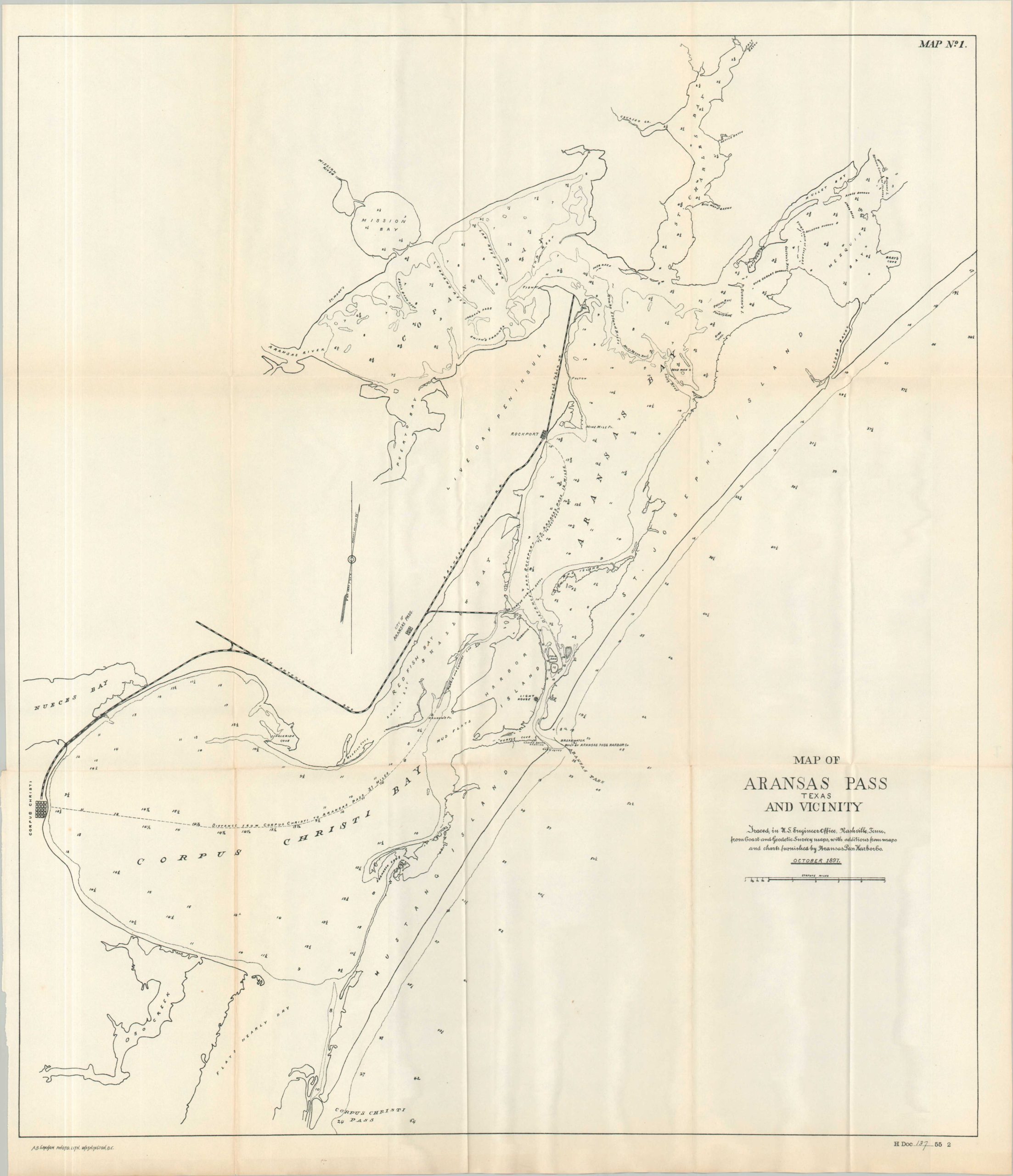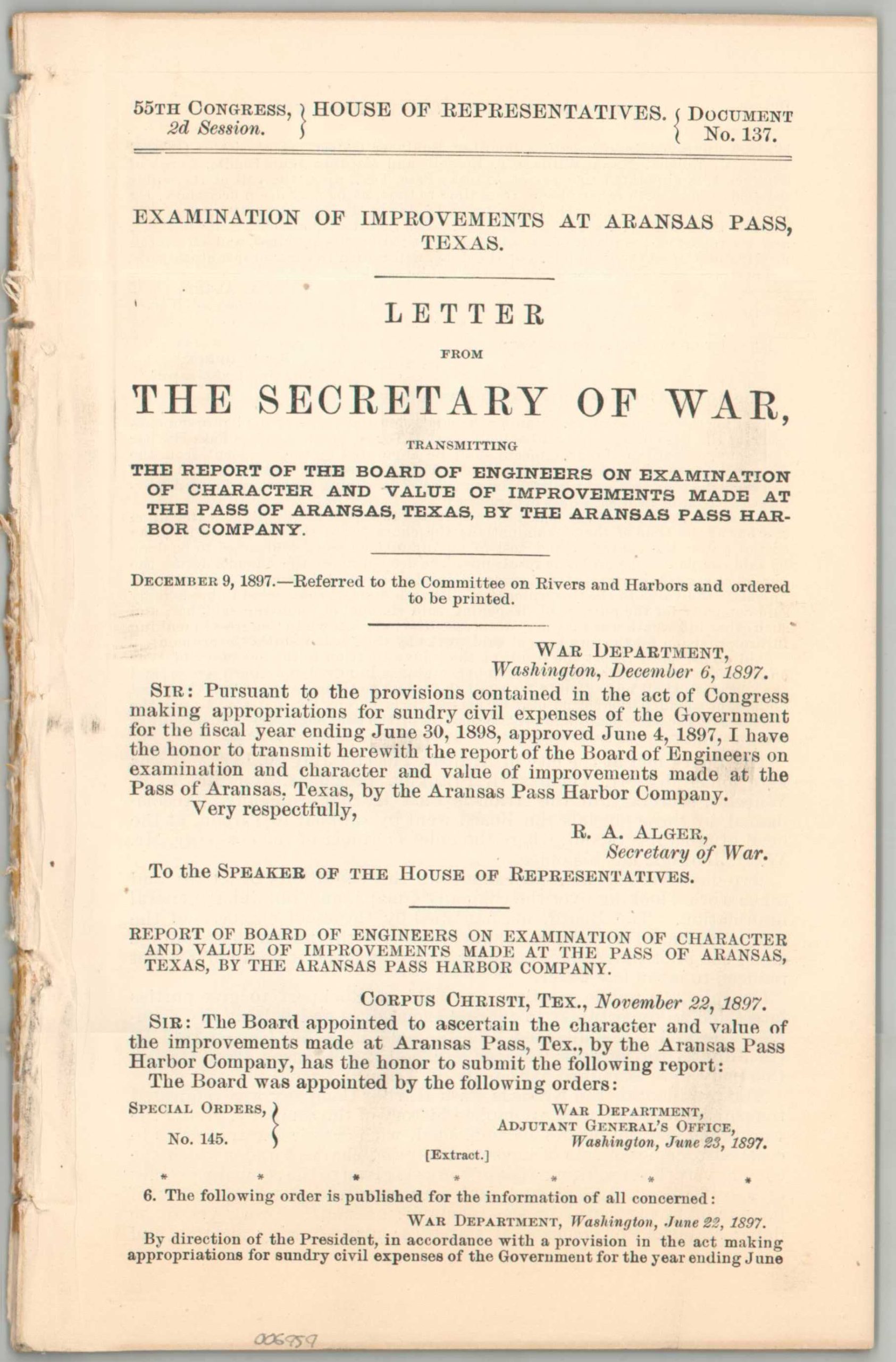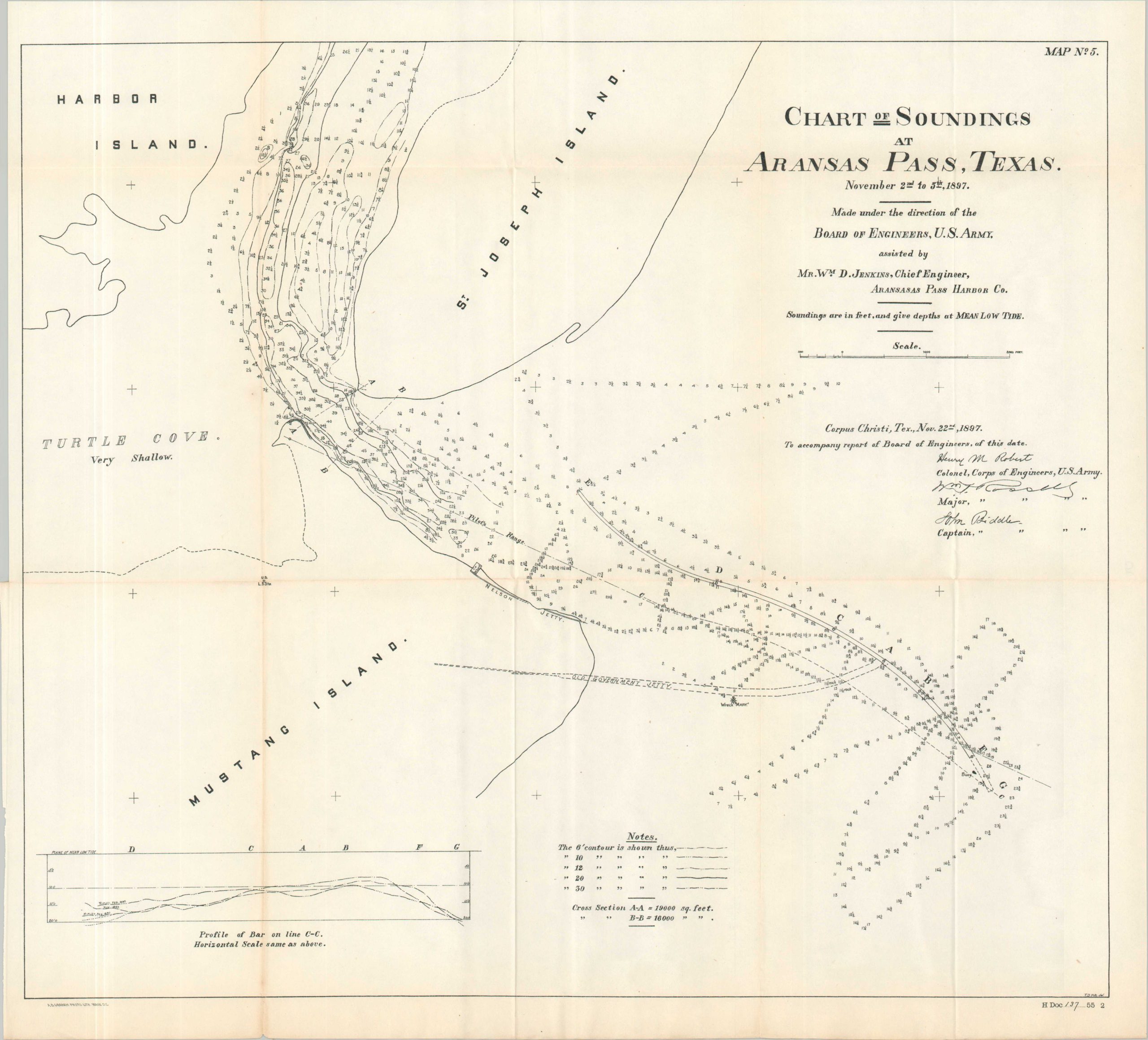 The late 19th century saw several efforts to establish Corpus Christi as a deepwater port on the Gulf Coast. Barrier islands provided a significant obstacle to construction and in 1890 the U.S. Government contracted with the newly-established Aransas Pass Harbor Company to dig a 20 ft. shipping channel through Aransas Pass. After several years of effort and millions of dollars expended, a trio of U.S. Army Corps of Engineers investigators reviewed the site to ascertain its progress.