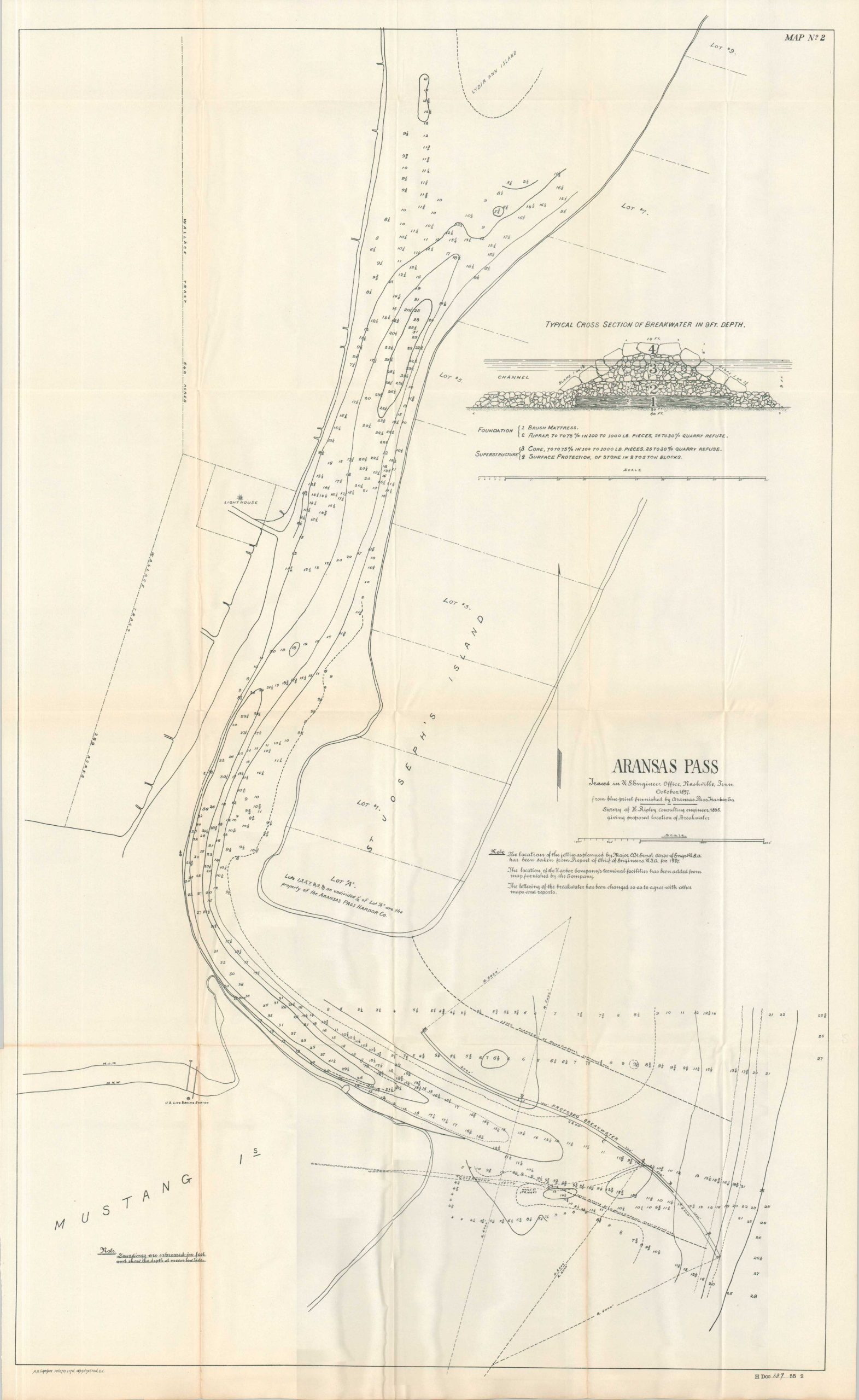 Their results, seen here, were originally published in a 1899 Congressional volume on internal improvements. Over forty pages of text provide a detailed summary of the work, including reports from the company, correspondence from the War Department, and an extensive financial analysis. An index map of the coastal area presents a geographic overview of the situation, noting the numerous bars, islands, and mud flats that block direct access between the populated bays (Corpus Christi, Aransas, etc.) and the Gulf of Mexico. This sheet is accompanied by larger-scale plans that show the work performed by the Aransas Pass Harbor Company and the results of the government inspectors.